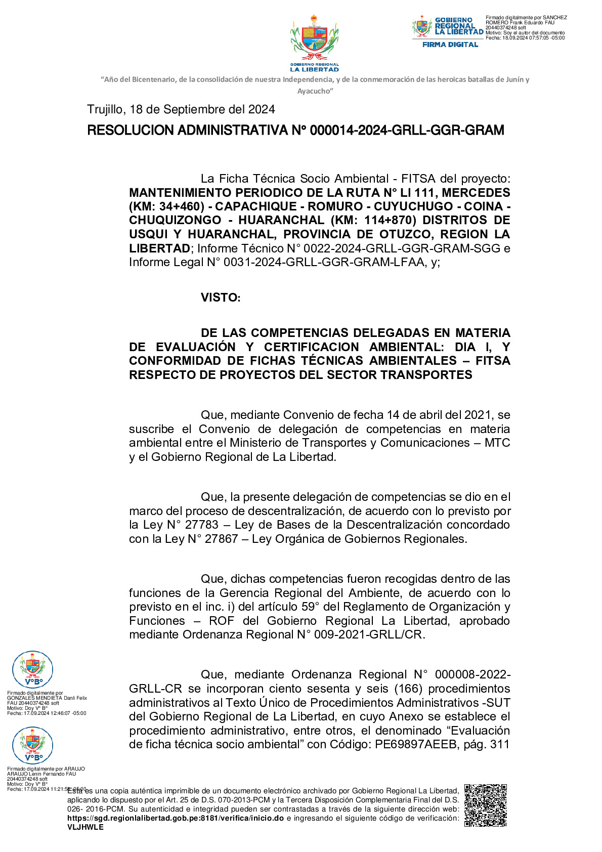 La Gerencia Regional del Ambiente, mediante RESOLUCION ADMINISTRATIVA N° 000014-2024-GRLL-GGR-GRAM, otorga la CONFORMIDAD a la Ficha Técnica Socio Ambiental (FITSA) del proyecto “MANTENIMIENTO PERIODICO DE LA RUTA N° LI 111, MERCEDES (KM: 34+460) -CAPACHIQUE - ROMURO - CUYUCHUGO - COINA - CHUQUIZONGO - HUARANCHAL (KM: 114+870) DISTRITOS DE USQUI Y HUARANCHAL, PROVINCIA DE OTUZCO, REGION LA LIBERTAD”.