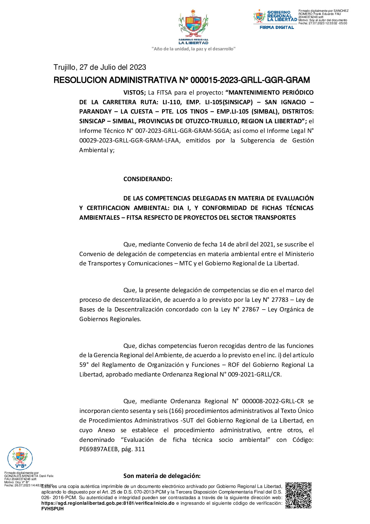 La Gerencia Regional del Ambiente, mediante RESOLUCION ADMINISTRATIVA N° 000015-2024-GRLL-GGR-GRAM, otorga la CONFORMIDAD a la Ficha Técnica Socio Ambiental (FITSA) del proyecto “MANTENIMIENTO PERIÓDICO DE LA CARRETERA RUTA: LI-110, EMP. LI-105(SINSICAP) – SAN IGNACIO – PARANDAY – LA CUESTA – PTE. LOS TINOS – EMP.LI-105 (SIMBAL), DISTRITOS: SINSICAP – SIMBAL, PROVINCIAS DE OTUZCO-TRUJILLO, REGION LA LIBERTAD”.