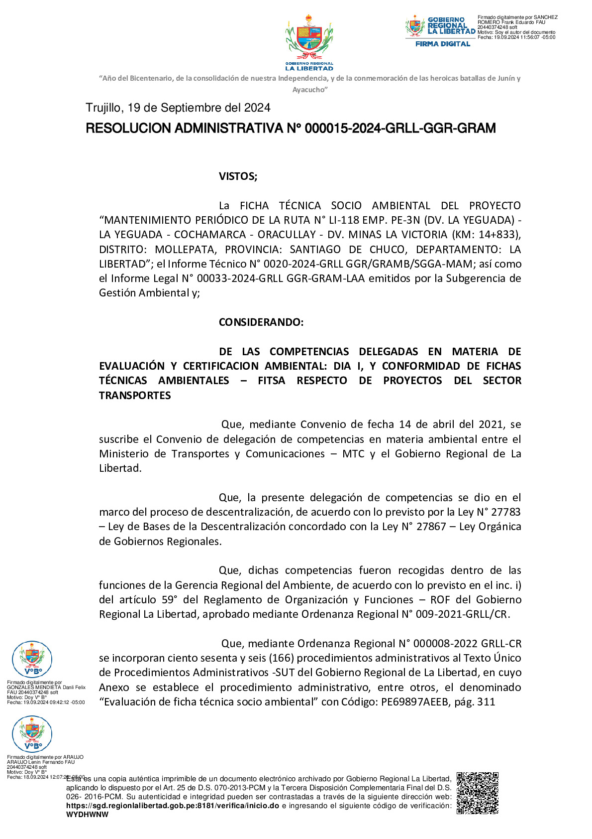 La Gerencia Regional del Ambiente, mediante RESOLUCION ADMINISTRATIVA N° 000015-2024-GRLL-GGR-GRAM, otorga la CONFORMIDAD a la Ficha Técnica Socio Ambiental (FITSA) del proyecto “MANTENIMIENTO PERIÓDICO DE LA RUTA N° LI-118 EMP. PE-3N (DV. LA YEGUADA) - LA YEGUADA - COCHAMARCA - ORACULLAY - DV. MINAS LA VICTORIA (KM: 14+833), DISTRITO: MOLLEPATA, PROVINCIA: SANTIAGO DE CHUCO, DEPARTAMENTO: LA LIBERTAD”.