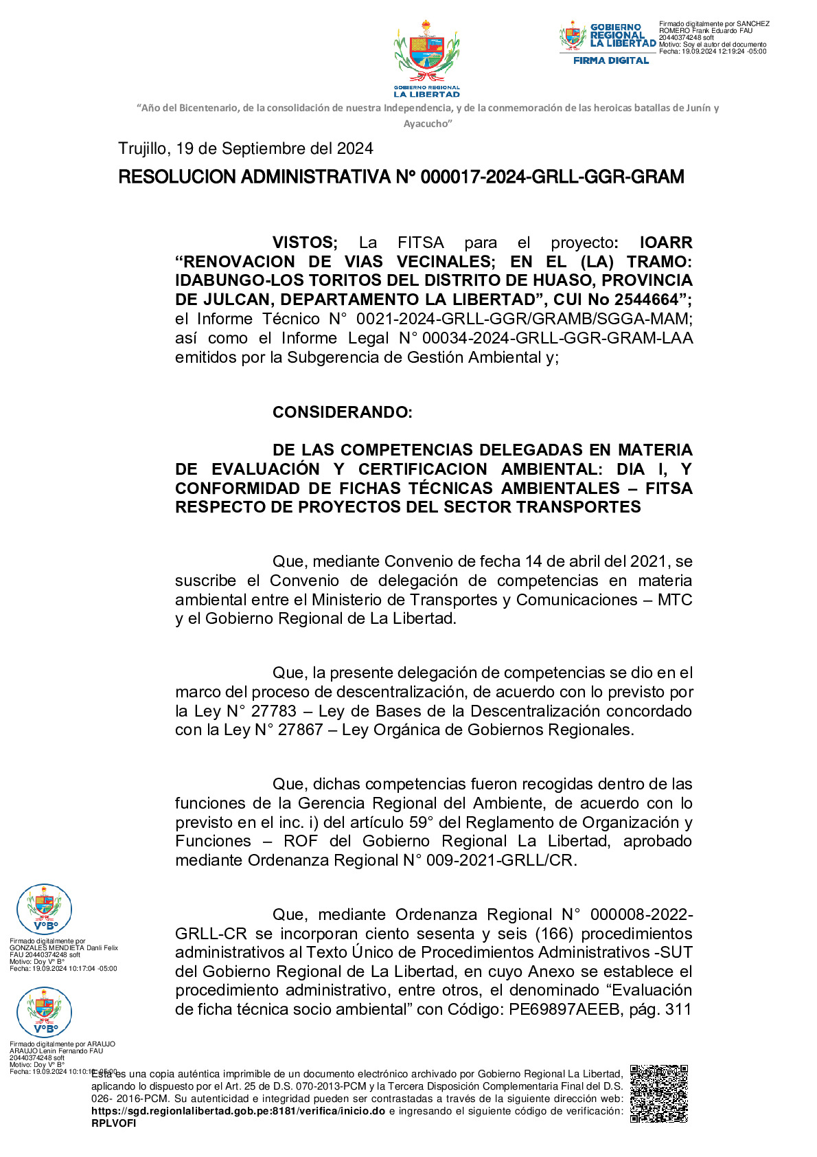 La Gerencia Regional del Ambiente, mediante RESOLUCION ADMINISTRATIVA N° 000017-2024-GRLL-GGR-GRAM, otorga la CONFORMIDAD a la Ficha Técnica Socio Ambiental (FITSA) del proyecto “MANTENIMIENTO PERIÓDICO DE LA CARRETERA RUTA N° LI-107, BOLIVAR (KM37+892)-UNAMEN - LAPLAC - DV. CIENEGA -UCHUMARCA - SAN VICENTE DE PAUL - CATAL - L.D. AMAZONAS (HUANABAMBA AM - 107 A BALSAS) (KM 123+612). DISTRITO: LONGOTEA, UCHUMARCA Y BOLÍVAR, PROVINCIA: BOLÍVAR, DEPARTAMENTO: LA LIBERTAD”.