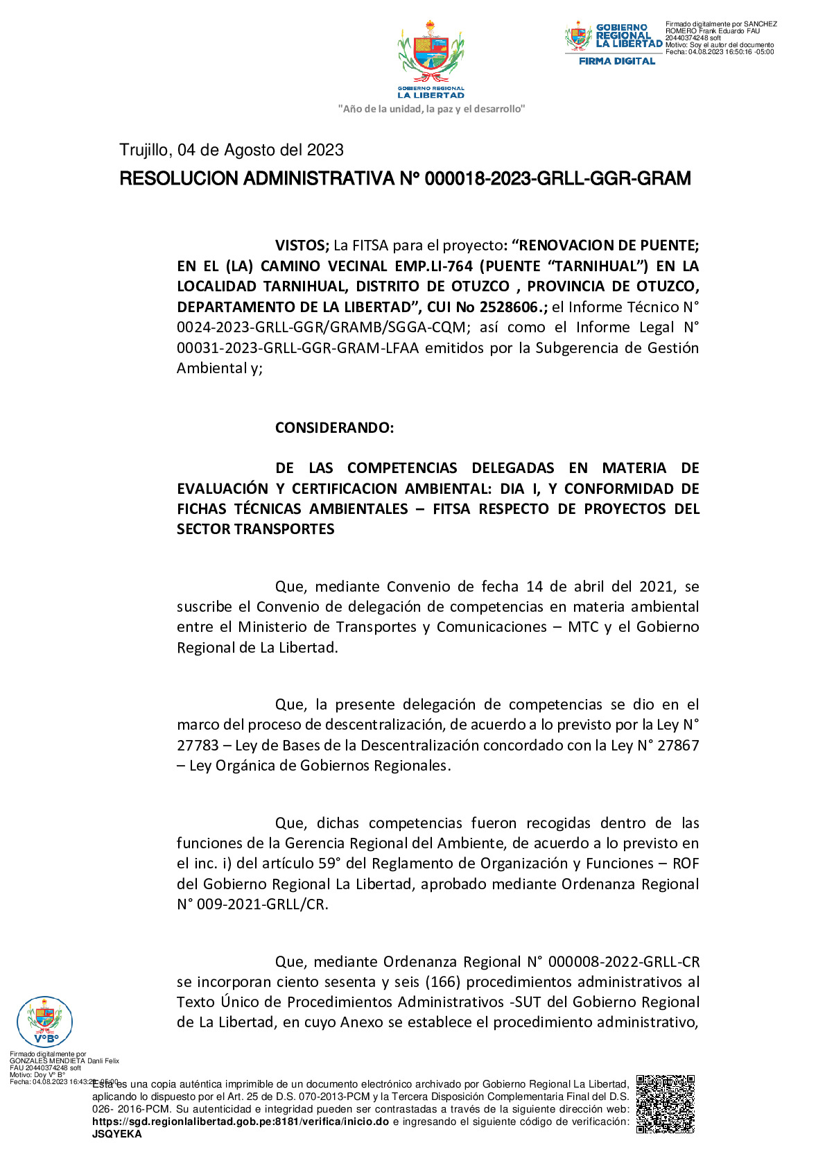 La Gerencia Regional del Ambiente, mediante RESOLUCION ADMINISTRATIVA N° 000018-2023-GRLL-GGR-GRAM, otorga la CONFORMIDAD a la Ficha Técnica Socio Ambiental (FITSA) del proyecto “RENOVACION DE PUENTE; EN EL (LA) CAMINO VECINAL EMP.LI-764 (PUENTE “TARNIHUAL”) EN LA LOCALIDAD TARNIHUAL, DISTRITO DE OTUZCO, PROVINCIA DE OTUZCO, DEPARTAMENTO DE LA LIBERTAD” con CUI N° 2528606.