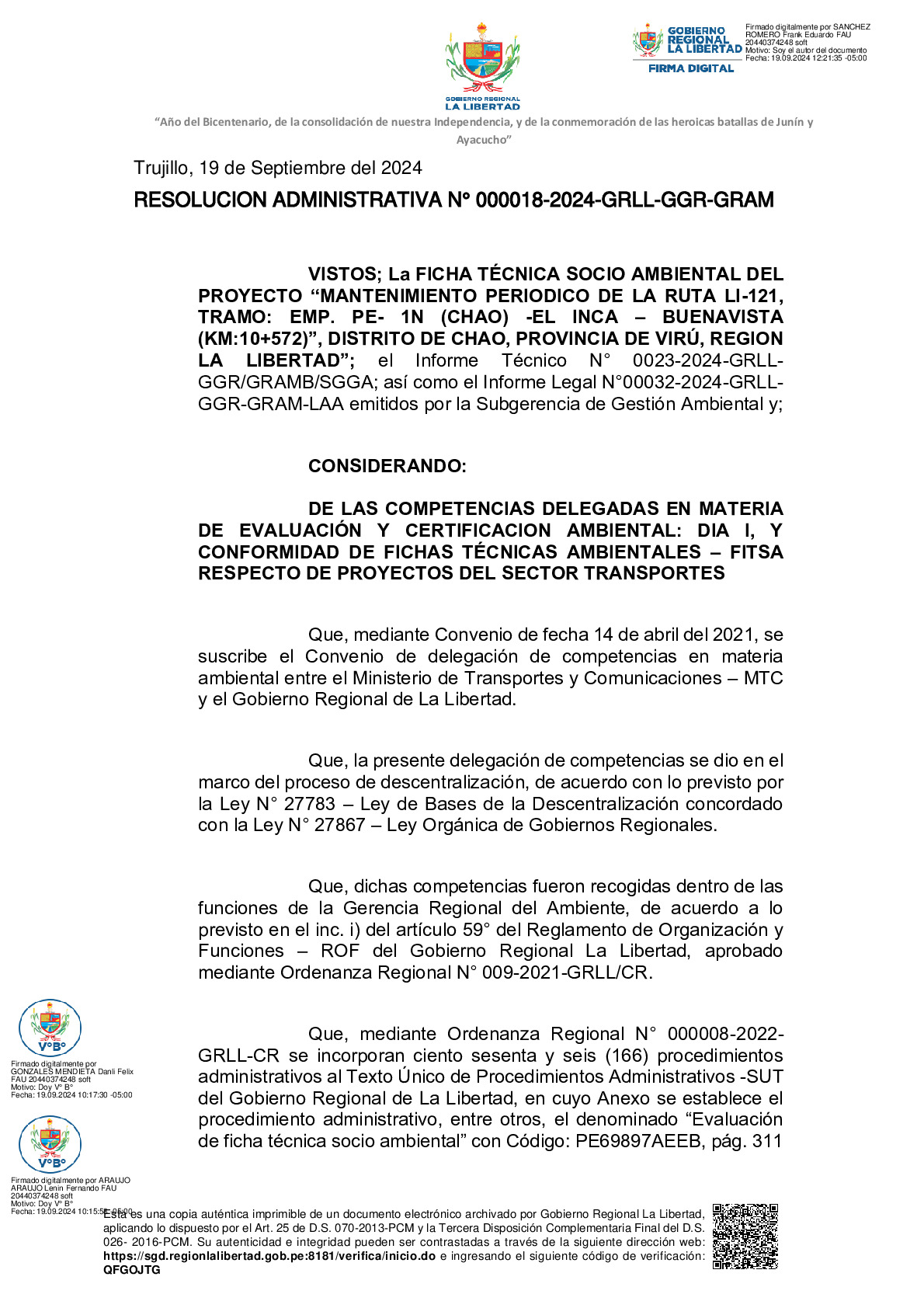 La Gerencia Regional del Ambiente, mediante RESOLUCION ADMINISTRATIVA N° 000018-2024-GRLL-GGR-GRAM, otorga la CONFORMIDAD a la Ficha Técnica Socio Ambiental (FITSA) del proyecto “MANTENIMIENTO PERIODICO DE LA RUTA LI-121, TRAMO: EMP. PE- 1N (CHAO) -EL INCA – BUENAVISTA (KM:10+572)”, DISTRITO DE CHAO, PROVINCIA DE VIRÚ, REGION LA LIBERTAD”.