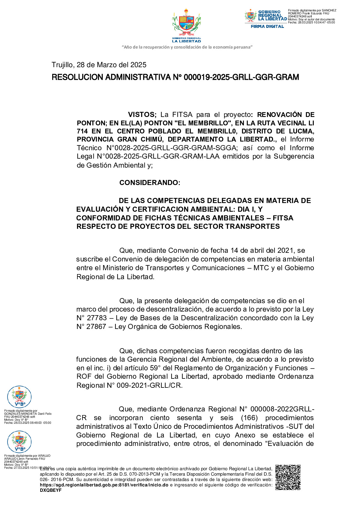 La Gerencia Regional del Ambiente, mediante RESOLUCION ADMINISTRATIVA N° 000019-2025-GRLL-GGR-GRAM, otorga la CONFORMIDAD a la Ficha Técnica Socio Ambiental (FITSA) del proyecto “RENOVACIÓN DE PONTON; EN EL(LA) PONTON "EL MEMBRILLO", EN LA RUTA VECINAL LI 714 EN EL CENTRO POBLADO EL MEMBRILLO, DISTRITO DE LUCMA, PROVINCIA GRAN CHIMÚ, DEPARTAMENTO LA LIBERTAD” con CUI N° 2637787.