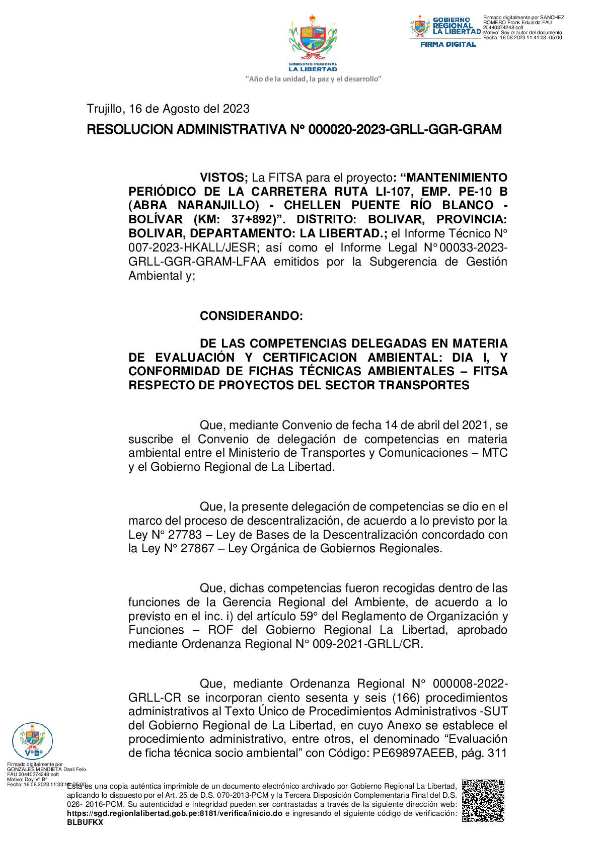 La Gerencia Regional del Ambiente, mediante RESOLUCION ADMINISTRATIVA N° 000020-2023-GRLL-GGR-GRAM, otorga la CONFORMIDAD a la Ficha Técnica Socio Ambiental (FITSA) del proyecto “MANTENIMIENTO PERIÓDICO DE LA CARRETERA RUTA LI-107, EMP. PE-10 B (ABRA NARANJILLO) - CHELLEN PUENTE RÍO BLANCO - BOLÍVAR (KM: 37+892)”. DISTRITO: BOLIVAR, PROVINCIA: BOLIVAR, DEPARTAMENTO: LA LIBERTAD".