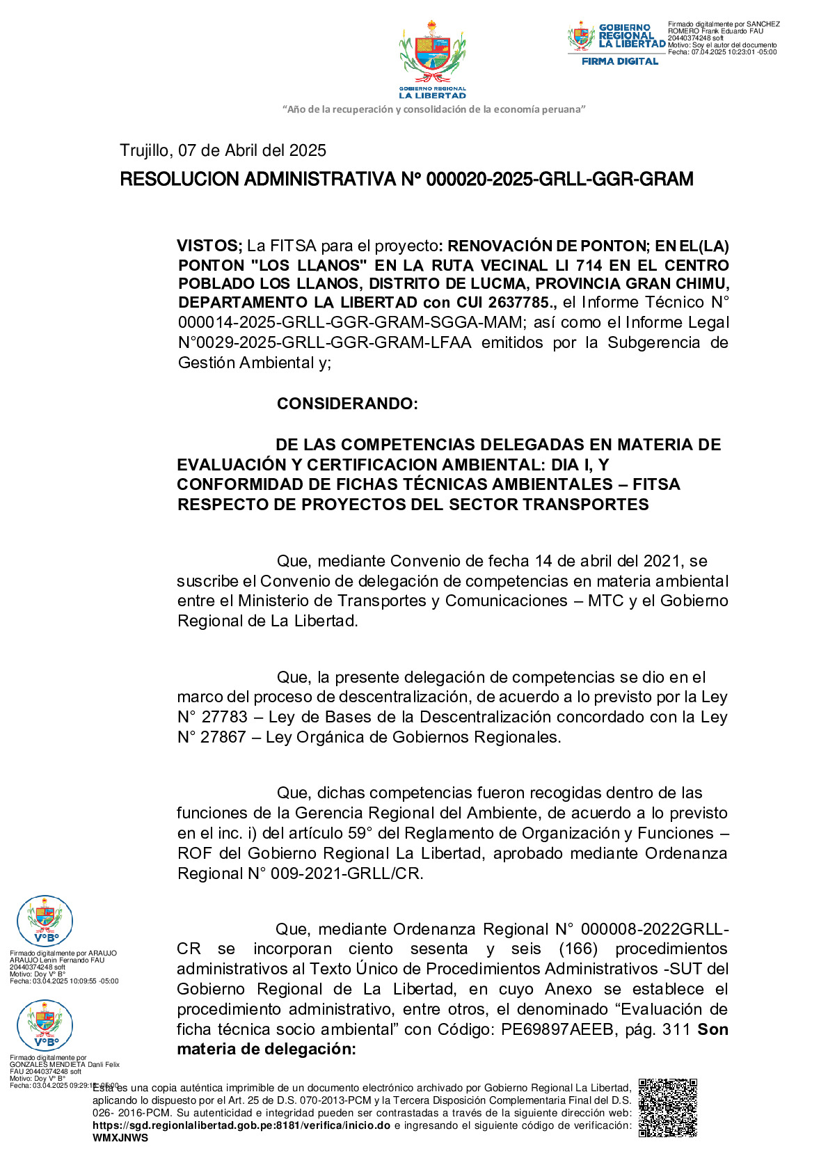 La Gerencia Regional del Ambiente, mediante RESOLUCION ADMINISTRATIVA N° 000020-2025-GRLL-GGR-GRAM, otorga la CONFORMIDAD a la Ficha Técnica Socio Ambiental (FITSA) del proyecto “RENOVACIÓN DE PONTON; EN EL(LA) PONTON "LOS LLANOS" EN LA RUTA VECINAL LI 714 EN EL CENTRO POBLADO LOS LLANOS, DISTRITO DE LUCMA, PROVINCIA GRAN CHIMÚ, DEPARTAMENTO LA LIBERTAD” con CUI N° 2637785.