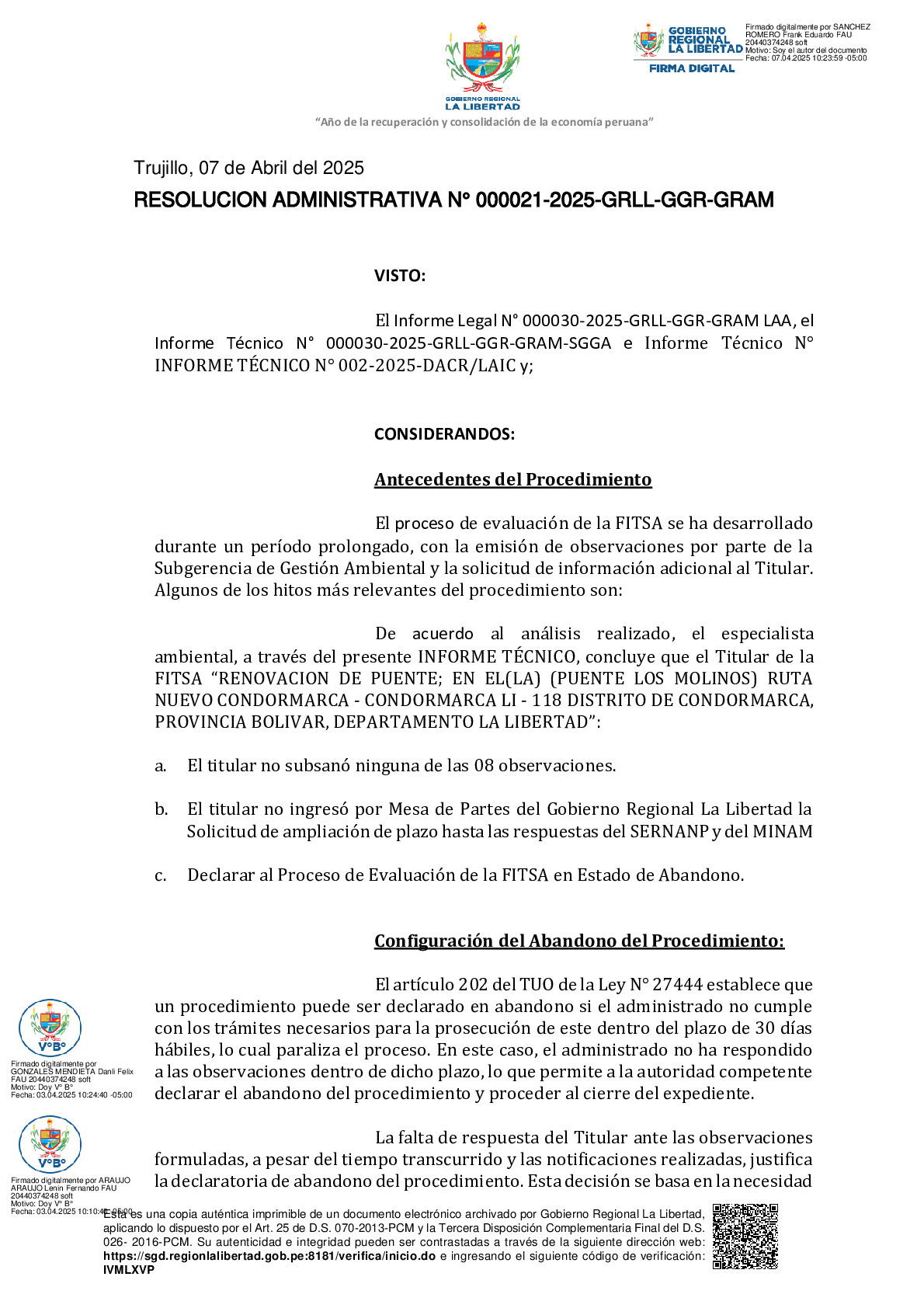 La Gerencia Regional del Ambiente, mediante RESOLUCION ADMINISTRATIVA N° 000021-2025-GRLL-GGR-GRAM, declara en ABANDONO y en consecuencia CONCLUIDO el procedimiento de evaluación de la Ficha Técnica Socio Ambiental (FITSA) del proyecto “RENOVACION DE PUENTE; EN EL(LA) (PUENTE LOS MOLINOS) RUTA NUEVO CONDORMARCA - CONDORMARCA LI - 118 DISTRITO DE CONDORMARCA, PROVINCIA BOLIVAR, DEPARTAMENTO LA LIBERTAD” con CUI N° 2637675.