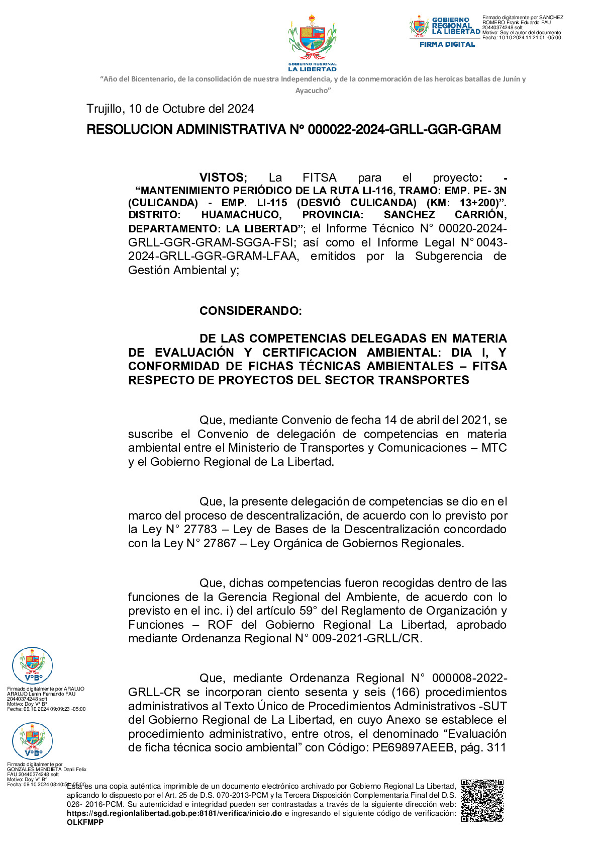 La Gerencia Regional del Ambiente, mediante RESOLUCION ADMINISTRATIVA N° 000022-2024-GRLL-GGR-GRAM, otorga la CONFORMIDAD a la Ficha Técnica Socio Ambiental (FITSA) del proyecto “MANTENIMIENTO PERIÓDICO DE LA RUTA LI-116, TRAMO: EMP. PE- 3N (CULICANDA) - EMP. LI-115 (DESVIÓ CULICANDA) (KM: 13+200)”. DISTRITO: HUAMACHUCO, PROVINCIA: SANCHEZ CARRIÓN, DEPARTAMENTO: LA LIBERTAD”.