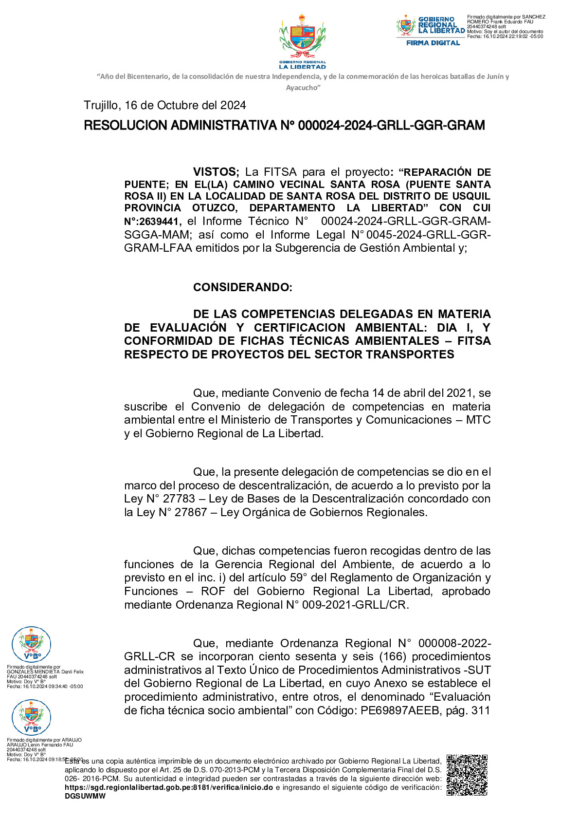 La Gerencia Regional del Ambiente, mediante RESOLUCION ADMINISTRATIVA N° 000024-2024-GRLL-GGR-GRAM, otorga la CONFORMIDAD a la Ficha Técnica Socio Ambiental (FITSA) del proyecto “REPARACIÓN DE PUENTE; EN EL(LA) CAMINO VECINAL SANTA ROSA (PUENTE SANTA ROSA II) EN LA LOCALIDAD DE SANTA ROSA DEL DISTRITO DE USQUIL PROVINCIA OTUZCO, DEPARTAMENTO LA LIBERTAD” con CUI N° 2639441.