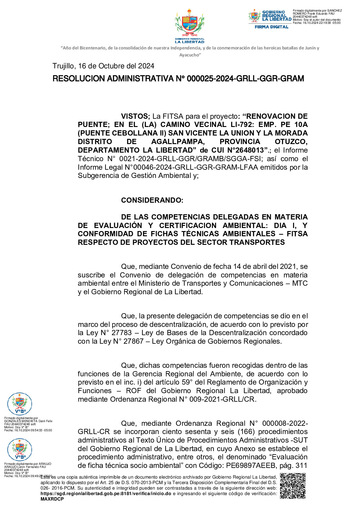La Gerencia Regional del Ambiente, mediante RESOLUCION ADMINISTRATIVA N° 000025-2024-GRLL-GGR-GRAM, otorga la CONFORMIDAD a la Ficha Técnica Socio Ambiental (FITSA) del proyecto “RENOVACION DE PUENTE; EN EL (LA) CAMINO VECINAL LI-792: EMP. PE 10A (PUENTE CEBOLLANA II) SAN VICENTE LA UNION Y LA MORADA DISTRITO DE AGALLPAMPA, PROVINCIA OTUZCO, DEPARTAMENTO LA LIBERTAD” con CUI N° 2648013.