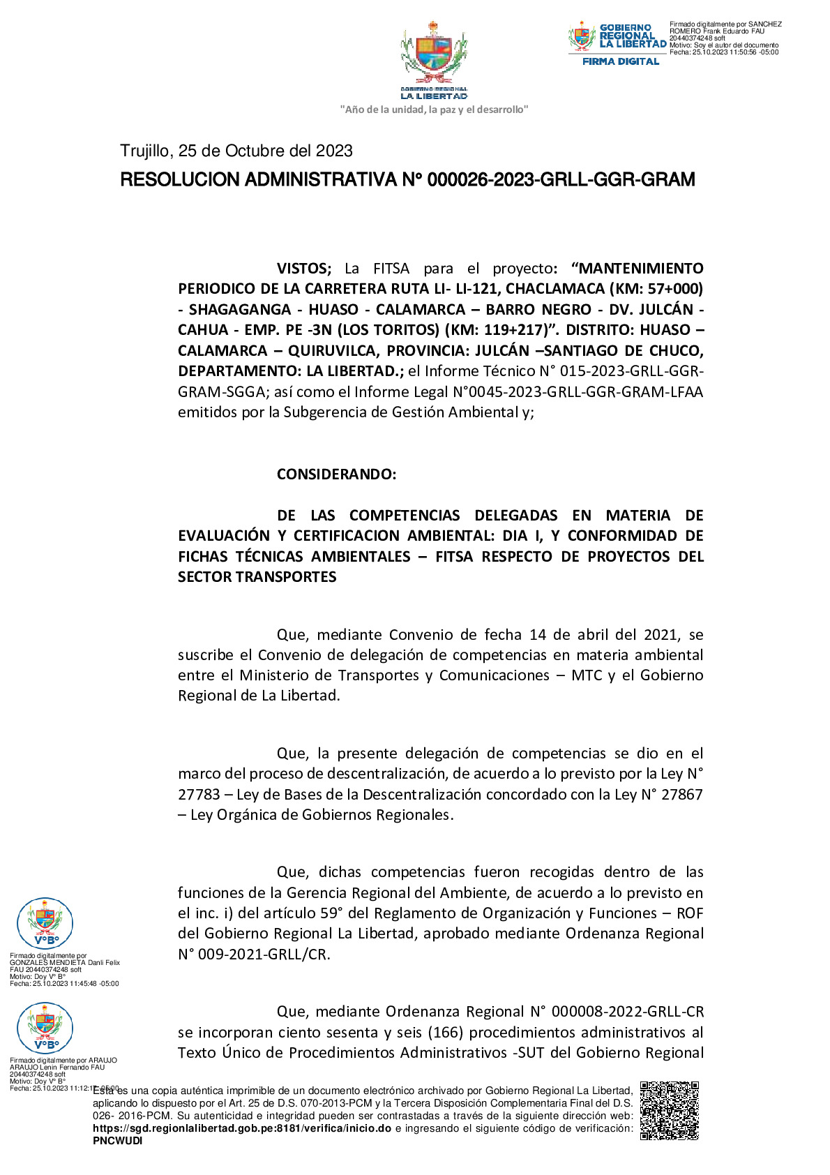 La Gerencia Regional del Ambiente, mediante RESOLUCION ADMINISTRATIVA N° 000026-2023-GRLL-GGR-GRAM, otorga la CONFORMIDAD a la Ficha Técnica Socio Ambiental (FITSA) del proyecto “MANTENIMIENTO PERIODICO DE LA CARRETERA RUTA LI- LI-121, CHACLAMACA (KM: 57+000) - SHAGAGANGA - HUASO - CALAMARCA – BARRO NEGRO - DV. JULCÁN - CAHUA - EMP. PE -3N (LOS TORITOS) (KM: 119+217)”. DISTRITO: HUASO – CALAMARCA – QUIRUVILCA, PROVINCIA: JULCÁN –SANTIAGO DE CHUCO, DEPARTAMENTO: LA LIBERTAD”.