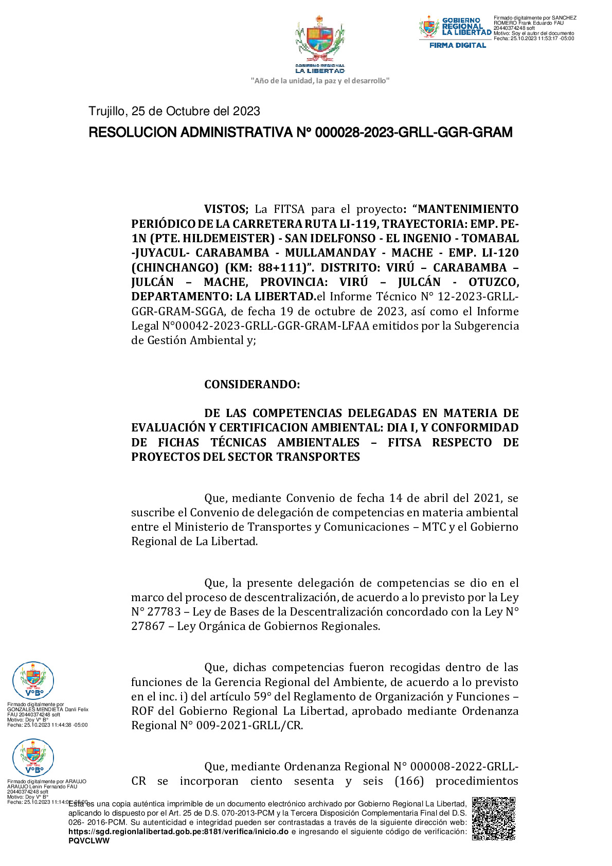 La Gerencia Regional del Ambiente, mediante RESOLUCION ADMINISTRATIVA N° 000028-2023-GRLL-GGR-GRAM, otorga la CONFORMIDAD a la Ficha Técnica Socio Ambiental (FITSA) del proyecto “MANTENIMIENTO PERIÓDICO DE LA CARRETERA RUTA LI-119, TRAYECTORIA: EMP. PE-