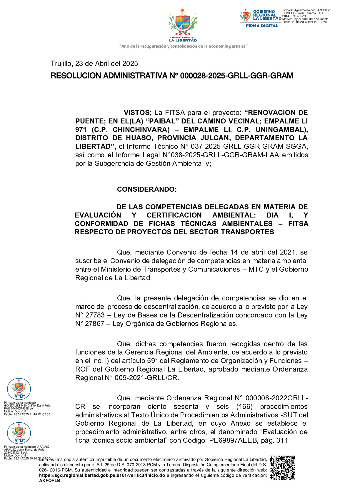 La Gerencia Regional del Ambiente, mediante RESOLUCION ADMINISTRATIVA N° 000028-2025-GRLL-GGR-GRAM, otorga la CONFORMIDAD a la Ficha Técnica Socio Ambiental (FITSA) del proyecto “RENOVACIÓN DE PUENTE; EN EL (LA) "PAIBAL" DEL CAMINO VECINAL; EMPALME LI 971 (C.P. CHINCHINVARA) - EMPALME LI. C.P.UNINGAMBAL) DISTRITO DE HUASO, PROVINCIA JULCAN, DEPARTAMENTO LA LIBERTAD” con CUI N° 2638151.