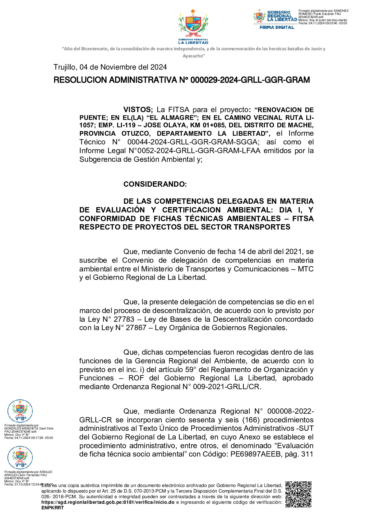 La Gerencia Regional del Ambiente, mediante RESOLUCION ADMINISTRATIVA N° 000029-2024-GRLL-GGR-GRAM, otorga la CONFORMIDAD a la Ficha Técnica Socio Ambiental (FITSA) del proyecto “RENOVACION DE PUENTE; EN EL(LA) “EL ALMAGRE”; EN EL CAMINO VECINAL RUTA LI-1057; EMP. LI-119 – JOSE OLAYA, KM 01+085, DEL DISTRITO DE MACHE, PROVINCIA OTUZCO, DEPARTAMENTO LA LIBERTAD”.