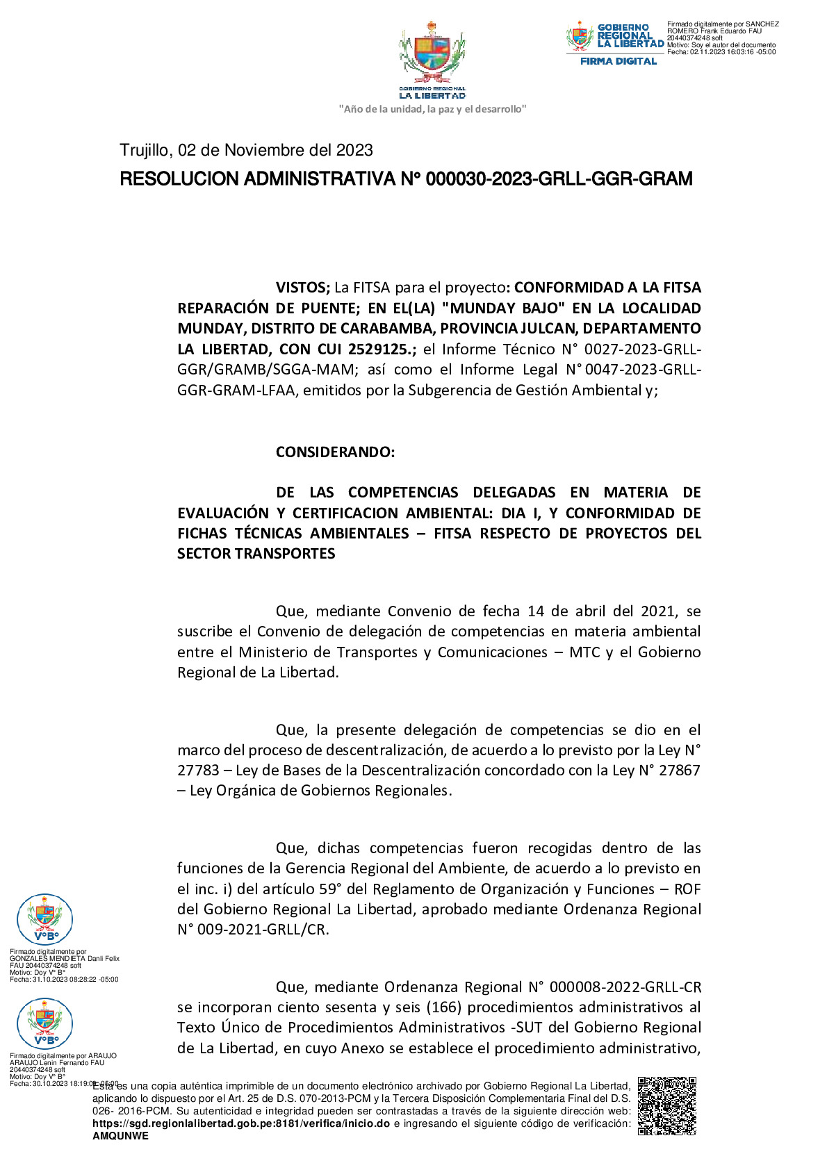 La Gerencia Regional del Ambiente, mediante RESOLUCION ADMINISTRATIVA N° 000030-2023-GRLL-GGR-GRAM, otorga la CONFORMIDAD a la Ficha Técnica Socio Ambiental (FITSA) del proyecto “REPARACIÓN DE PUENTE; EN EL(LA) "MUNDAY BAJO" EN LA LOCALIDAD MUNDAY, DISTRITO DE CARABAMBA, PROVINCIA JULCAN, DEPARTAMENTO LA LIBERTAD” con CUI N° 2529125.