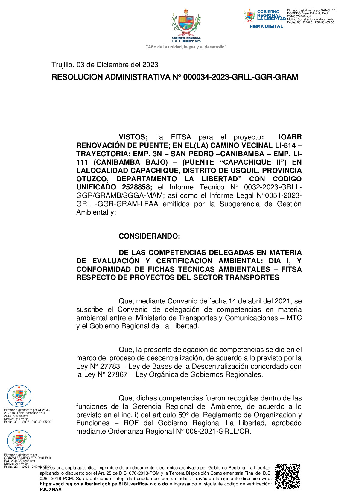 La Gerencia Regional del Ambiente, mediante RESOLUCION ADMINISTRATIVA N° 000034-2023-GRLL-GGR-GRAM, otorga la CONFORMIDAD a la Ficha Técnica Socio Ambiental (FITSA) del proyecto “RENOVACIÓN DE PUENTE; EN EL(LA) CAMINO VECINAL LI-814 – TRAYECTORIA: EMP. 3N – SAN PEDRO –CANIBAMBA – EMP. LI-111 (CANIBAMBA BAJO) – (PUENTE “CAPACHIQUE II”) EN LA LOCALIDAD CAPACHIQUE, DISTRITO DE USQUIL, PROVINCIA OTUZCO, DEPARTAMENTO LA LIBERTAD” con CUI N° 2528858.