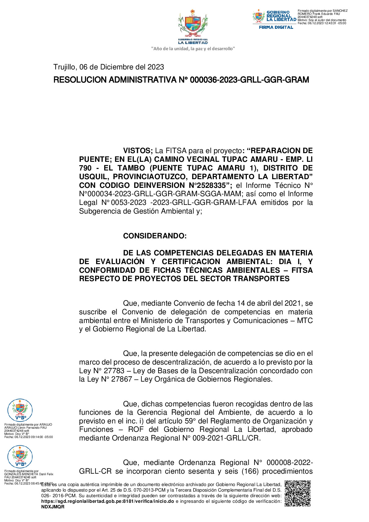 La Gerencia Regional del Ambiente, mediante RESOLUCION ADMINISTRATIVA N° 000036-2023-GRLL-GGR-GRAM, otorga la CONFORMIDAD a la Ficha Técnica Socio Ambiental (FITSA) del proyecto “REPARACION DE PUENTE; EN EL(LA) CAMINO VECINAL TUPAC AMARU - EMP. LI 790 - EL TAMBO (PUENTE TUPAC AMARU 1), DISTRITO DE USQUIL, PROVINCIAOTUZCO, DEPARTAMENTO LA LIBERTAD” con CUI N° 2528335.