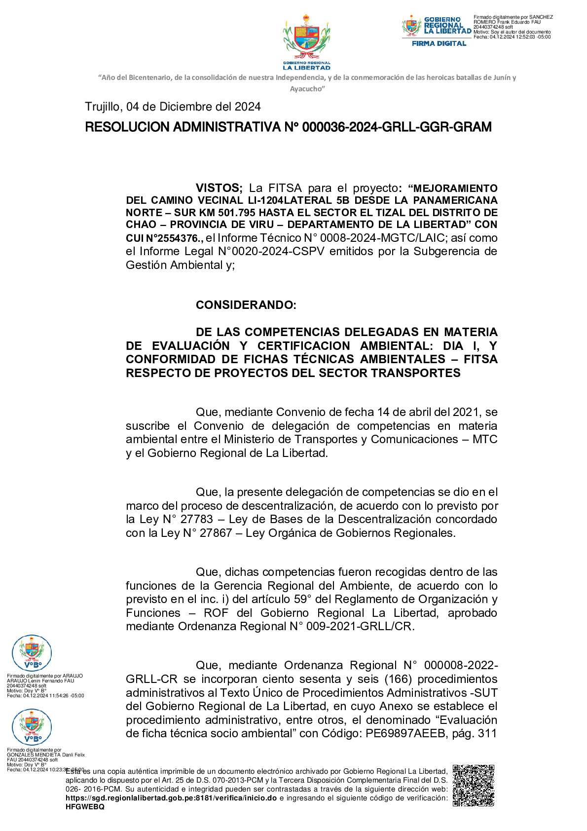La Gerencia Regional del Ambiente, mediante RESOLUCION ADMINISTRATIVA N° 000035-2024-GRLL-GGR-GRAM, otorga la CONFORMIDAD a la Ficha Técnica Socio Ambiental (FITSA) del proyecto “MEJORAMIENTO DEL CAMINO VECINAL LI-1204LATERAL 5B DESDE LA PANAMERICANA NORTE – SUR KM 501.795 HASTA EL SECTOR EL TIZAL DEL DISTRITO DE CHAO – PROVINCIA DE VIRU – DEPARTAMENTO DE LA LIBERTAD” con CUI N° 2554376.