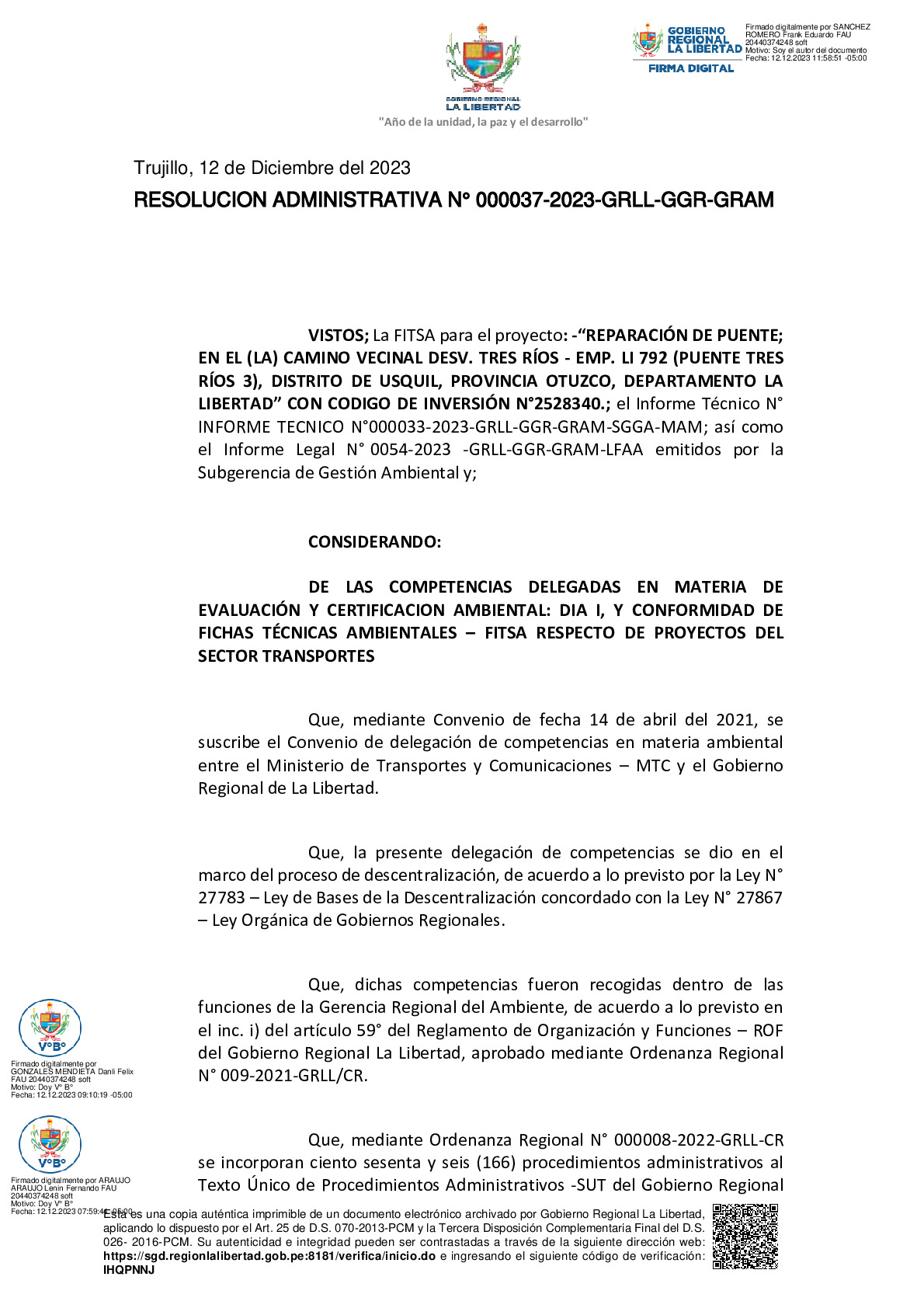 La Gerencia Regional del Ambiente, mediante RESOLUCION ADMINISTRATIVA N° 000037-2023-GRLL-GGR-GRAM, otorga la CONFORMIDAD a la Ficha Técnica Socio Ambiental (FITSA) del proyecto “REPARACIÓN DE PUENTE; EN EL (LA) CAMINO VECINAL DESV. TRES RÍOS - EMP. LI 792 (PUENTE TRES RÍOS 3), DISTRITO DE USQUIL, PROVINCIA OTUZCO, DEPARTAMENTO LA LIBERTAD” con CUI N° 2528340.