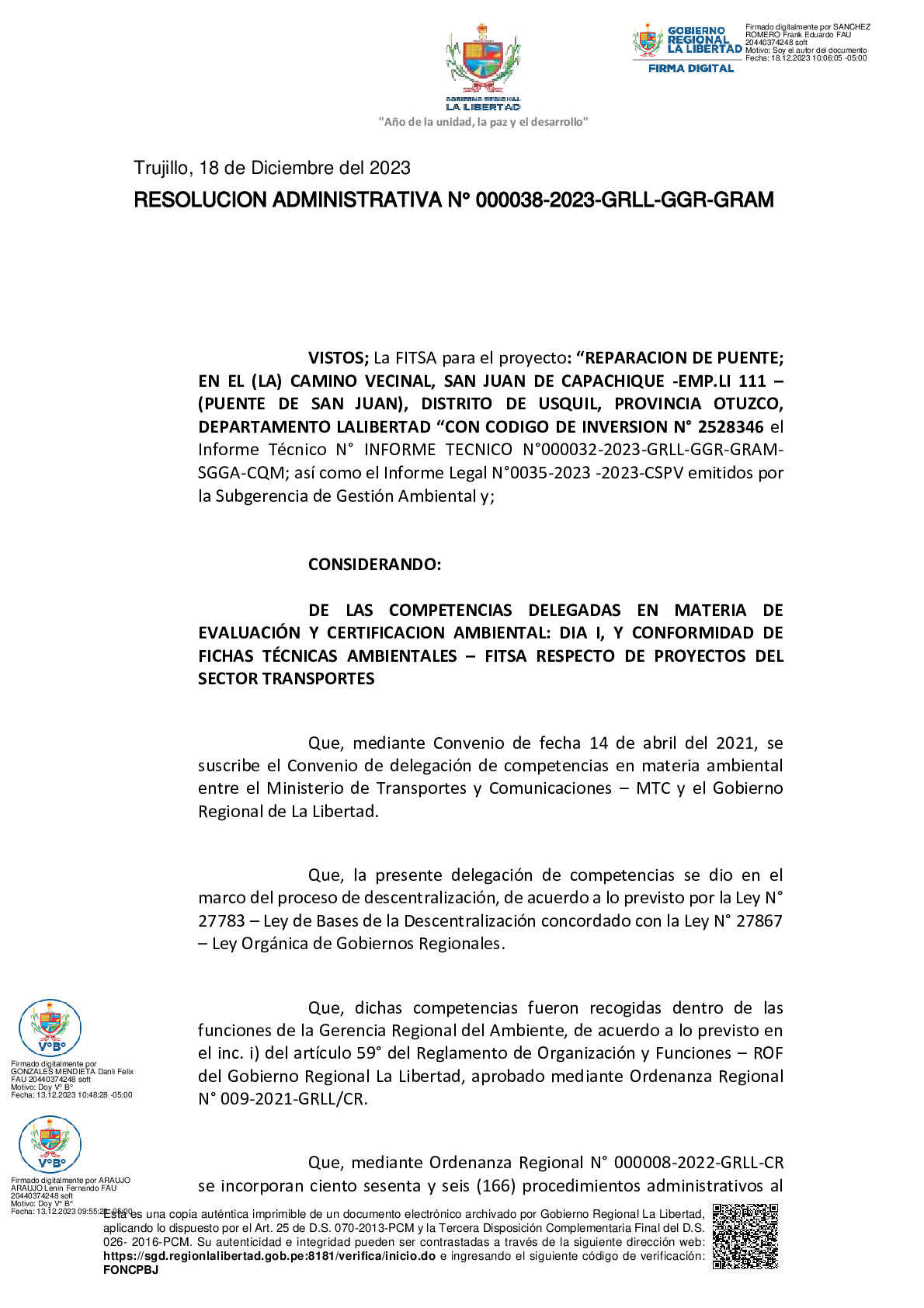 La Gerencia Regional del Ambiente, mediante RESOLUCION ADMINISTRATIVA N° 000038-2023-GRLL-GGR-GRAM, otorga la CONFORMIDAD a la Ficha Técnica Socio Ambiental (FITSA) del proyecto “REPARACION DE PUENTE; EN EL (LA) CAMINO VECINAL, SAN JUAN DE CAPACHIQUE -EMP.LI 111 – (PUENTE DE SAN JUAN), DISTRITO DE USQUIL, PROVINCIA OTUZCO, DEPARTAMENTO LA LIBERTAD” con CUI N° 2528346.