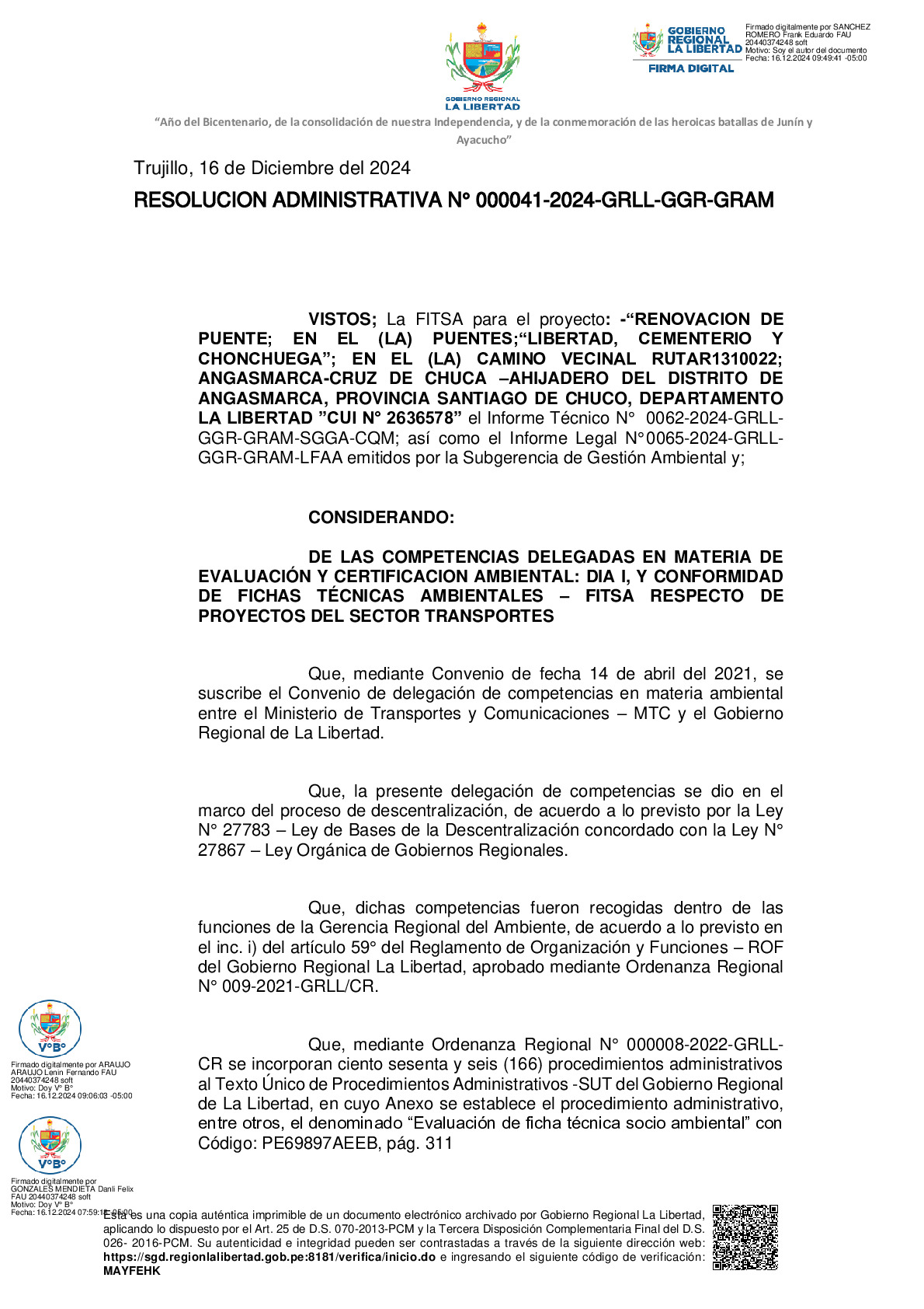 La Gerencia Regional del Ambiente, mediante RESOLUCION ADMINISTRATIVA N° 000041-2024-GRLL-GGR-GRAM, otorga la CONFORMIDAD a la Ficha Técnica Socio Ambiental (FITSA) del proyecto “RENOVACION DE PUENTE; EN EL (LA) PUENTES;“LIBERTAD, CEMENTERIO Y CHONCHUEGA”; EN EL (LA) CAMINO VECINAL RUTAR1310022; ANGASMARCA-CRUZ DE CHUCA –AHIJADERO DEL DISTRITO DE ANGASMARCA, PROVINCIA SANTIAGO DE CHUCO, DEPARTAMENTO LA LIBERTAD” con CUI N° 2636578.