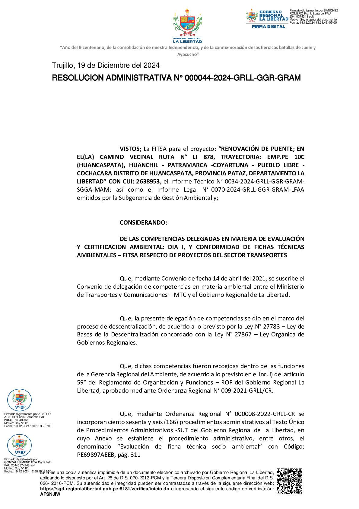 La Gerencia Regional del Ambiente, mediante RESOLUCION ADMINISTRATIVA N° 000044-2024-GRLL-GGR-GRAM, otorga la CONFORMIDAD a la Ficha Técnica Socio Ambiental (FITSA) del proyecto “RENOVACIÓN DE PUENTE; EN EL(LA) CAMINO VECINAL RUTA N° LI 878, TRAYECTORIA: EMP.PE 10C (HUANCASPATA), HUANCHIL - PATRAMARCA -COYARTUNA - PUEBLO LIBRE -COCHACARA DISTRITO DE HUANCASPATA, PROVINCIA PATAZ, DEPARTAMENTO LA LIBERTAD” con CUI N° 2638953.