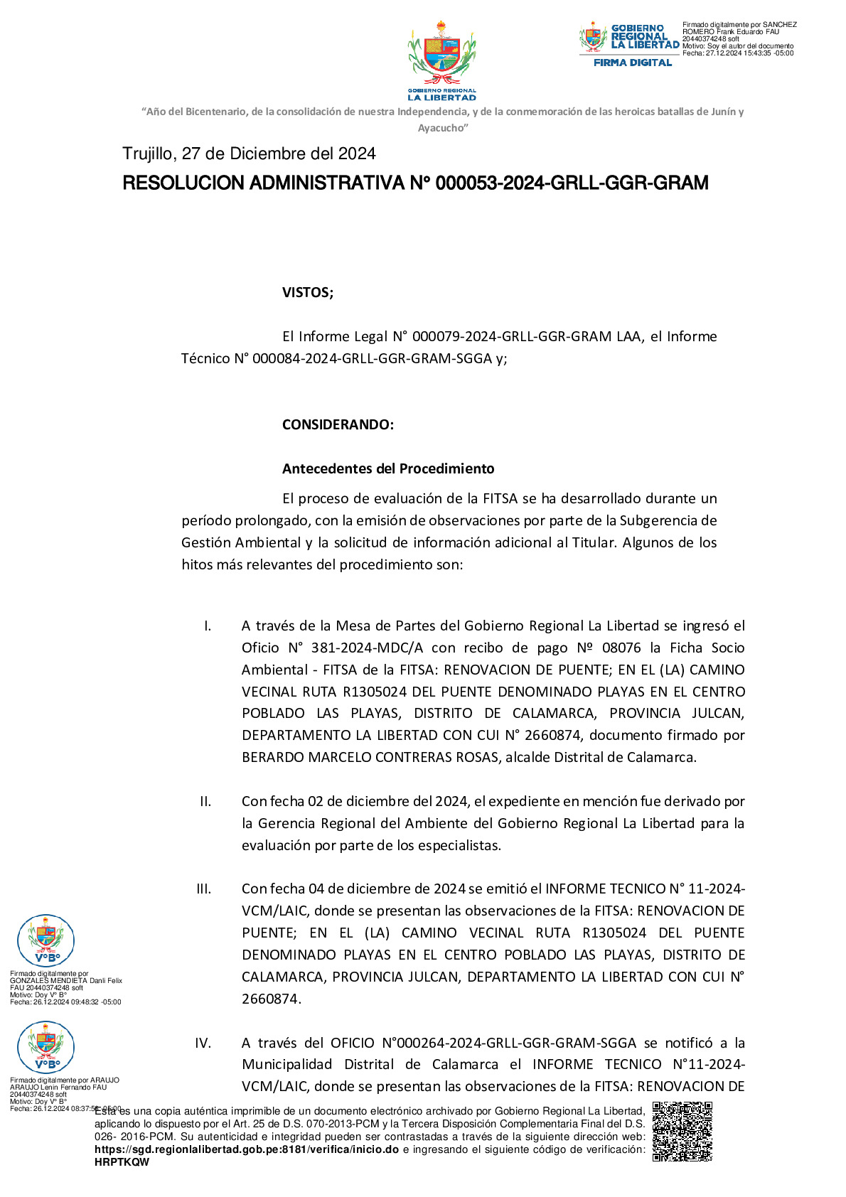 La Gerencia Regional del Ambiente, mediante RESOLUCION ADMINISTRATIVA N° 000053-2024-GRLL-GGR-GRAM, declara en ABANDONO y en consecuencia CONCLUIDO el procedimiento de evaluación de la Ficha Técnica Socio Ambiental (FITSA) del proyecto “RENOVACION DE PUENTE; EN EL (LA) CAMINO VECINAL RUTA R1305024 DEL PUENTE DENOMINADO PLAYAS EN EL CENTRO POBLADO LAS PLAYAS, DISTRITO DE CALAMARCA, PROVINCIA JULCAN, DEPARTAMENTO LA LIBERTAD”.