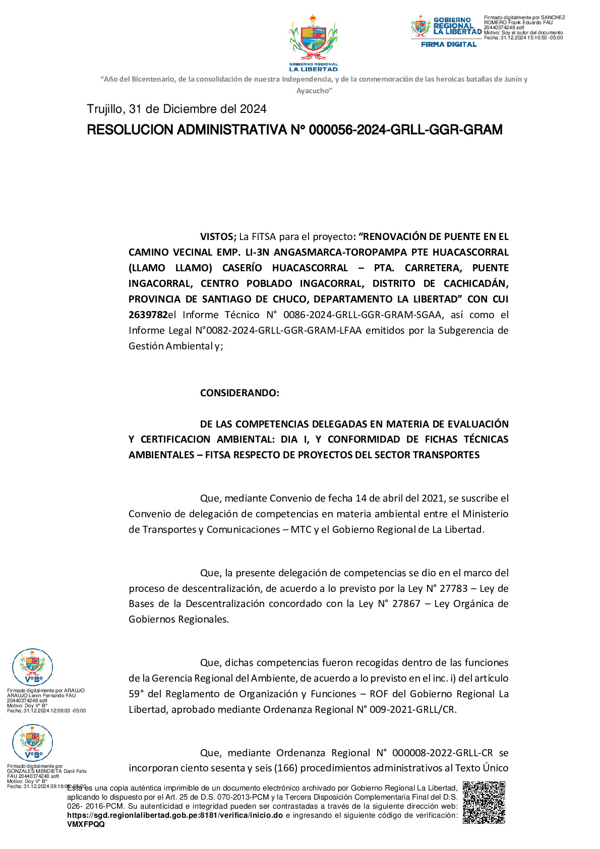 La Gerencia Regional del Ambiente, mediante RESOLUCION ADMINISTRATIVA N° 000056-2024-GRLL-GGR-GRAM, otorga la CONFORMIDAD a la Ficha Técnica Socio Ambiental (FITSA) del proyecto “RENOVACIÓN DE PUENTE EN EL CAMINO VECINAL EMP. LI-3N ANGASMARCA-TOROPAMPA PTE HUACASCORRAL (LLAMO LLAMO) CASERÍO HUACASCORRAL – PTA. CARRETERA, PUENTE INGACORRAL, CENTRO POBLADO INGACORRAL, DISTRITO DE CACHICADÁN, PROVINCIA DE SANTIAGO DE CHUCO, DEPARTAMENTO LA LIBERTAD” con CUI N° 2639782.