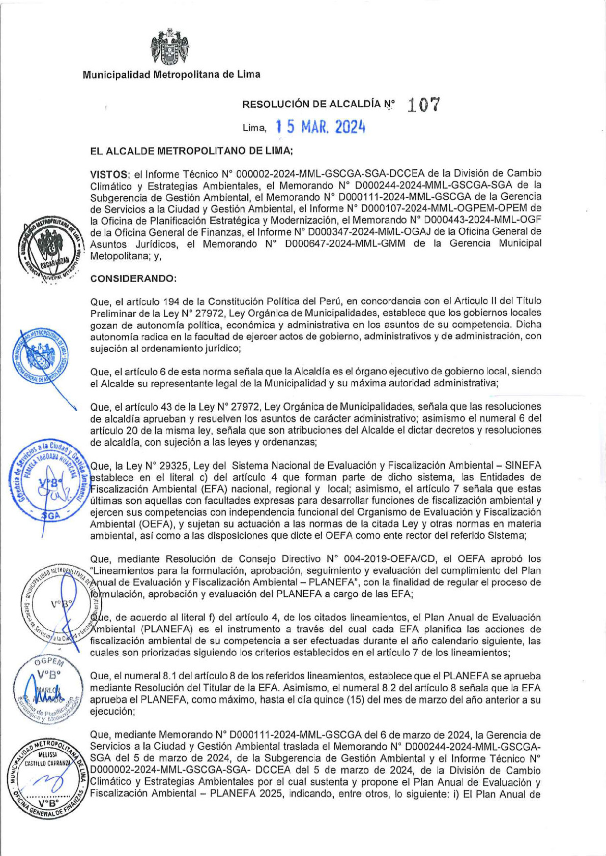 Resolución de Alcaldía N° 107-2024 que aprueba el Plan de Evaluación y Fiscalización Ambiental - PLANEFA 2025 de la Municipalidad de Lima