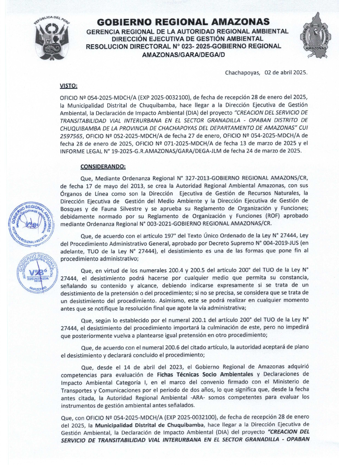 ARTÍCULO PRIMERO: ACEPTAR el DESISTIMIENTO del procedimiento administrativo de evaluación de la Declaración de Impacto Ambiental DIA del proyecto "CREACIÓN DEL SERVICIO DE TRANSITABILIDAD VIAL INTERURBANA EN EL SECTOR GRANADILLA - OPABAN DISTRITO DE CHUQUIBAMBA DE LA PROVINCIA DE CHACHAPOYAS DEL DEPARTAMENTO DE AMAZONAS" CUI 2597565, solicitada por la Municipalidad Distrital de Chuquibamba, dándose por concluido el referido procedimiento. [...]