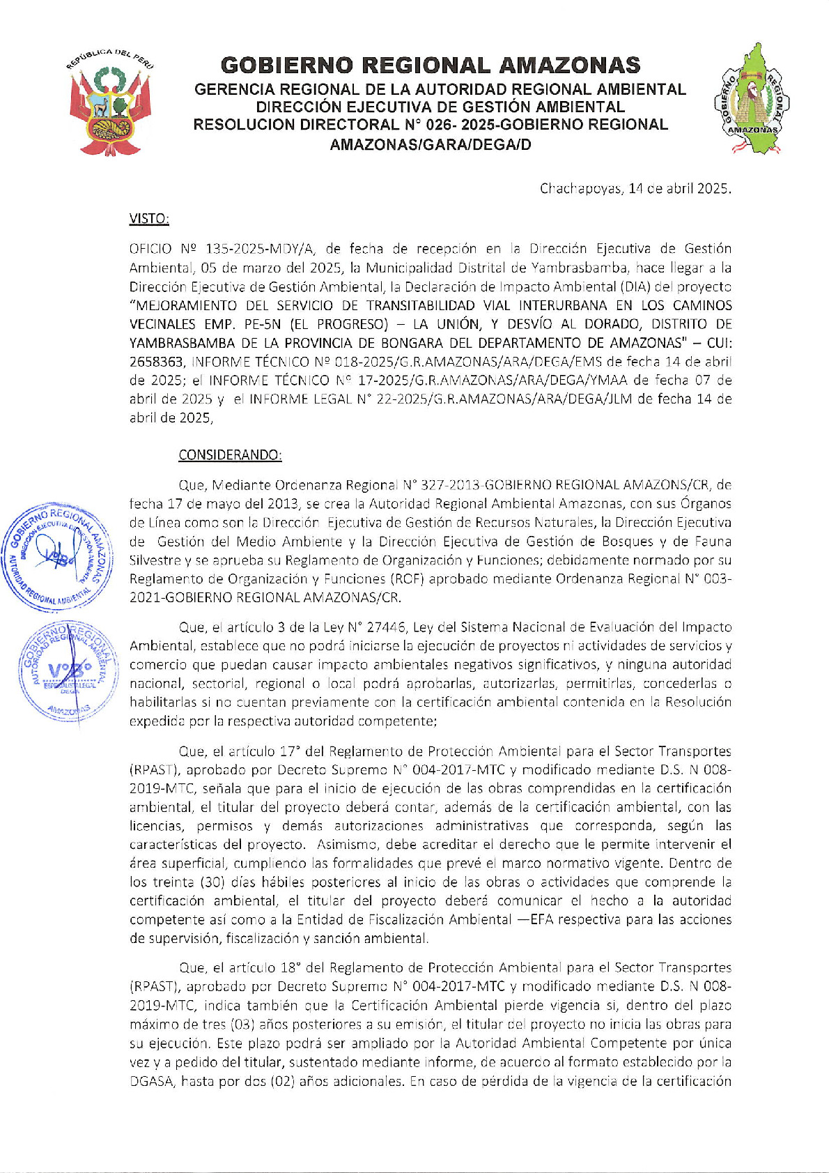 ARTÍCULO PRIMERO: OTORGAR LA CONFORMIDAD A LA DECLARACIÓN DE IMPACTO AMBIENTAL (DIA) del proyecto "MEJORAMIENTO DEL SERVICIO DE TRANSITABILIDAD VIAL INTERURBANA EN LOS CAMINOS VECINALES EMP. PE-5N (EL PROGRESO) - LA UNIÓN, Y DESVÍO AL DORADO, DISTRITO DE YAMBRASBAMBA DE LA PROVINCIA DE BONGARA DEL DEPARTAMENTO DE AMAZONAS" CUI: 2658363, presentada por la Municipalidad Distrital de Yambrasbamba, de conformidad con las consideraciones expuestas en la presente resolución [...]