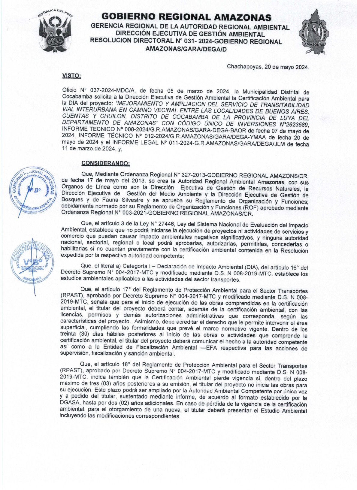 OTORGAR la Certificación Ambiental en la Categoría I Declaración de Impacto Ambiental (DIA) al proyecto: "MEJORAMIENTO Y AMPLIACION DEL SERVICIO DE TRANSITABILIDAD VIAL INTERURBANA EN CAMINO VECINAL ENTRE LAS LOCALIDADES DE BUENOS AIRES, CUENTAS Y CHUILON, DISTRITO DE COCABAMBA DE LA PROVINCIA DE LUYA DEL DEPARTAMENTO DE AMAZONAS" CON CÓDIGO ÚNICO DE INVERSIONES N°2623589", cuyo titular es la Municipalidad Distrital de Cocabamba, de conformidad con las consideraciones expuestas en la presente resolución.