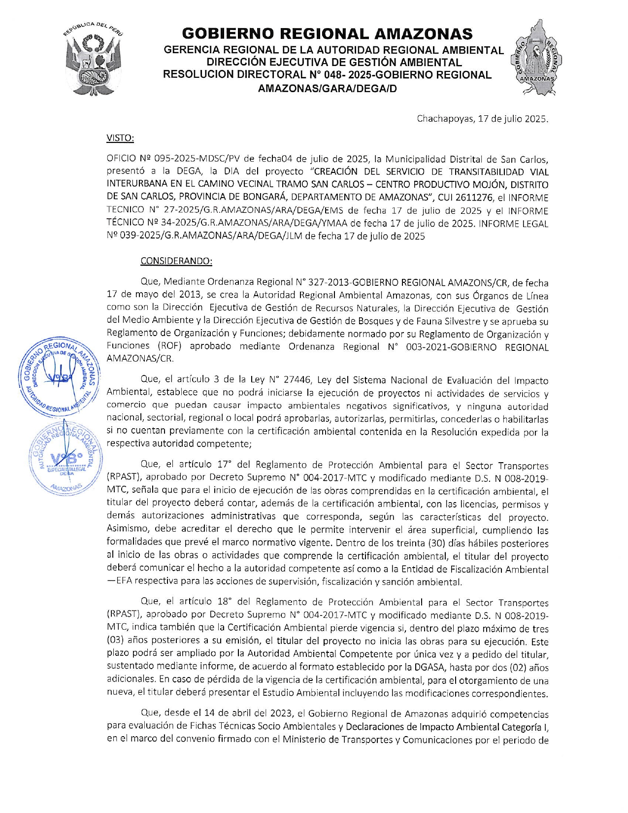 ARTÍCULO PRIMERO: OTORGAR LA CONFORMIDAD A LA DECLARACIÓN DE IMPACTO AMBIENTAL - (DIA) del proyecto "CREACIÓN DEL SERVICIO DE TRANSITABILIDAD VIAL INTERURBANA EN EL CAMINO VECINAL TRAMO SAN CARLOS - CENTRO PRODUCTIVO MOJÓN, DISTRITO DE SAN CARLOS, PROVINCIA DE BONGARA, DEPARTAMENTO DE AMAZONAS" CUI 2611276, -presentado por la Municipalidad Distrital de San Carlos, de conformidad con las consideraciones expuestas en la presente resolución [...]