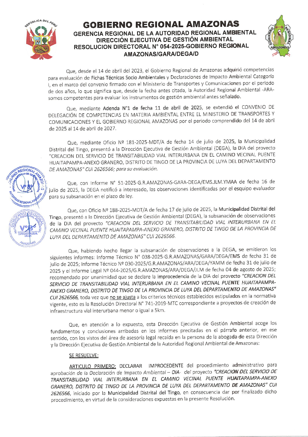 ARTÍCULO PRIMERO: DECLARAR IMPRPCEDENTE A LA DECLARACIÓN DE IMPACTO AMBIENTAL - (DIA) del proyecto "CREACIÓN DEL SERVICIO DE TRANSITABILIDAD VIAL INTERURBANA EN EL CAMINO VECINAL PUENTE HUAITAPAMPA-ANEXO GRANERO, DISTRITO DEL TINGO, PROVINCIA DE LUYA, DEPARTAMENTO DE AMAZONAS" CUI 2626566, -presentado por la Municipalidad Distrital del Tingo, de conformidad con las consideraciones expuestas en la presente resolución [...]