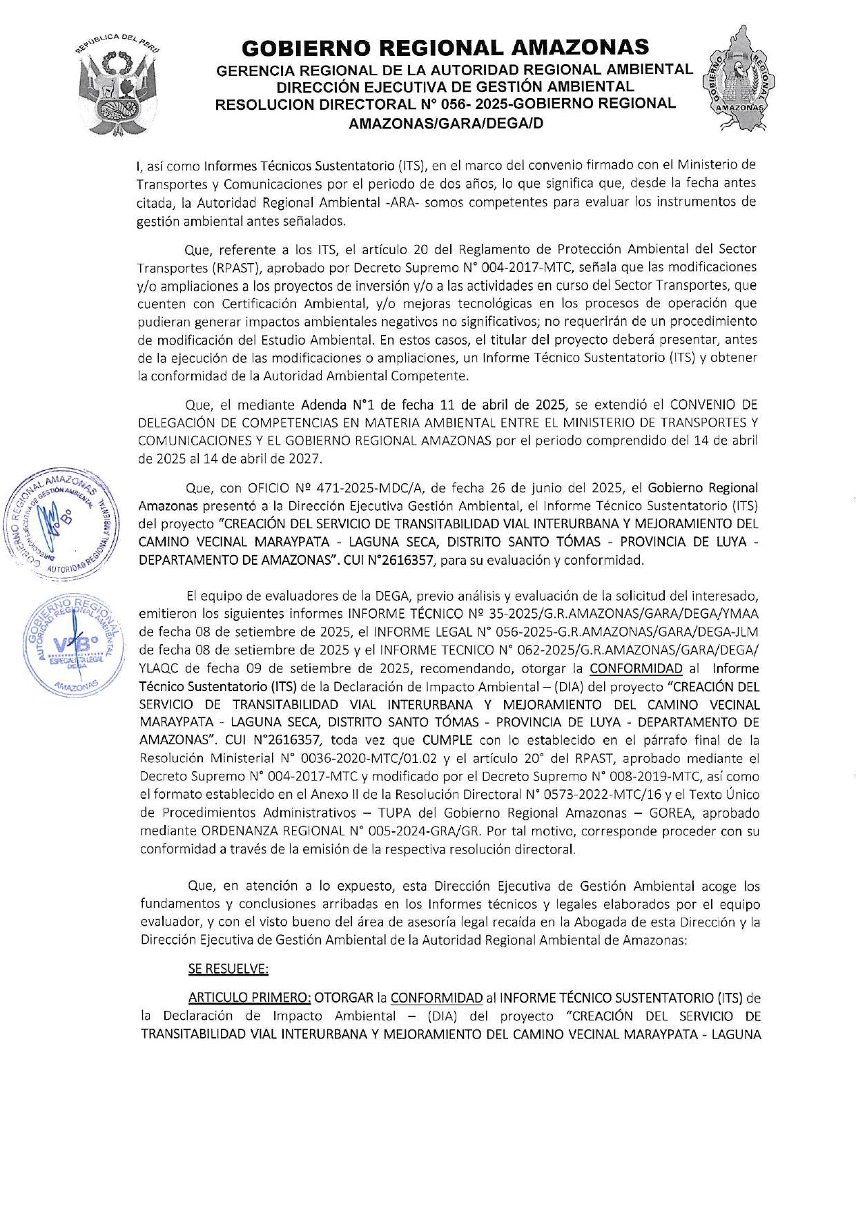 ARTÍCULO PRIMERO: Declarar LA CONFORMIDAD al Informe Técnico Sustentatorio (ITS) de la DECLARACIÓN DE IMPACTO AMBIENTAL - (DIA) del proyecto "CREACIÓN DEL SERVICIOS DE TRANSITABILIDAD VIAL INTERURBANA Y MEJORAMIENTO DEL CAMINO VECINAL MARAYPATA - LAGUNA SECA, DISTRITO DE SANTO TOMAS, PROVINCIA DE LUYA, DEPARTAMENTO DE AMAZONAS" CUI 2616357, presentada por la Municipalidad Distrital de Santo Tomas, de conformidad con las consideraciones expuestas en la presente resolución [...]