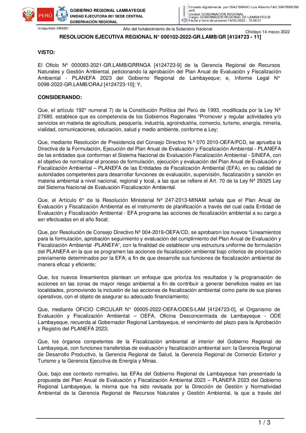 Resolución Ejecutiva Regional que aprueba el Plan Anual de Evaluación y Fiscalización Ambiental – PLANEFA 2023