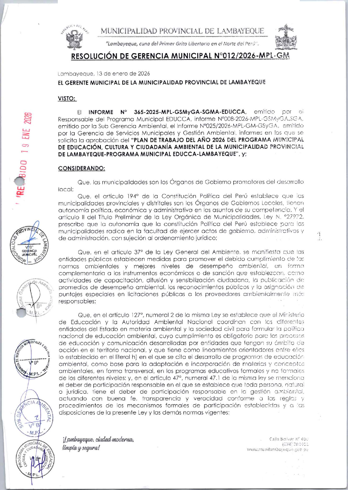 Resolución de Gerencia Municipal que aprueba el Plan de Trabajo del Programa Municipal EDUCCA 2026 de la Municipalidad Provincial de Lambayeque