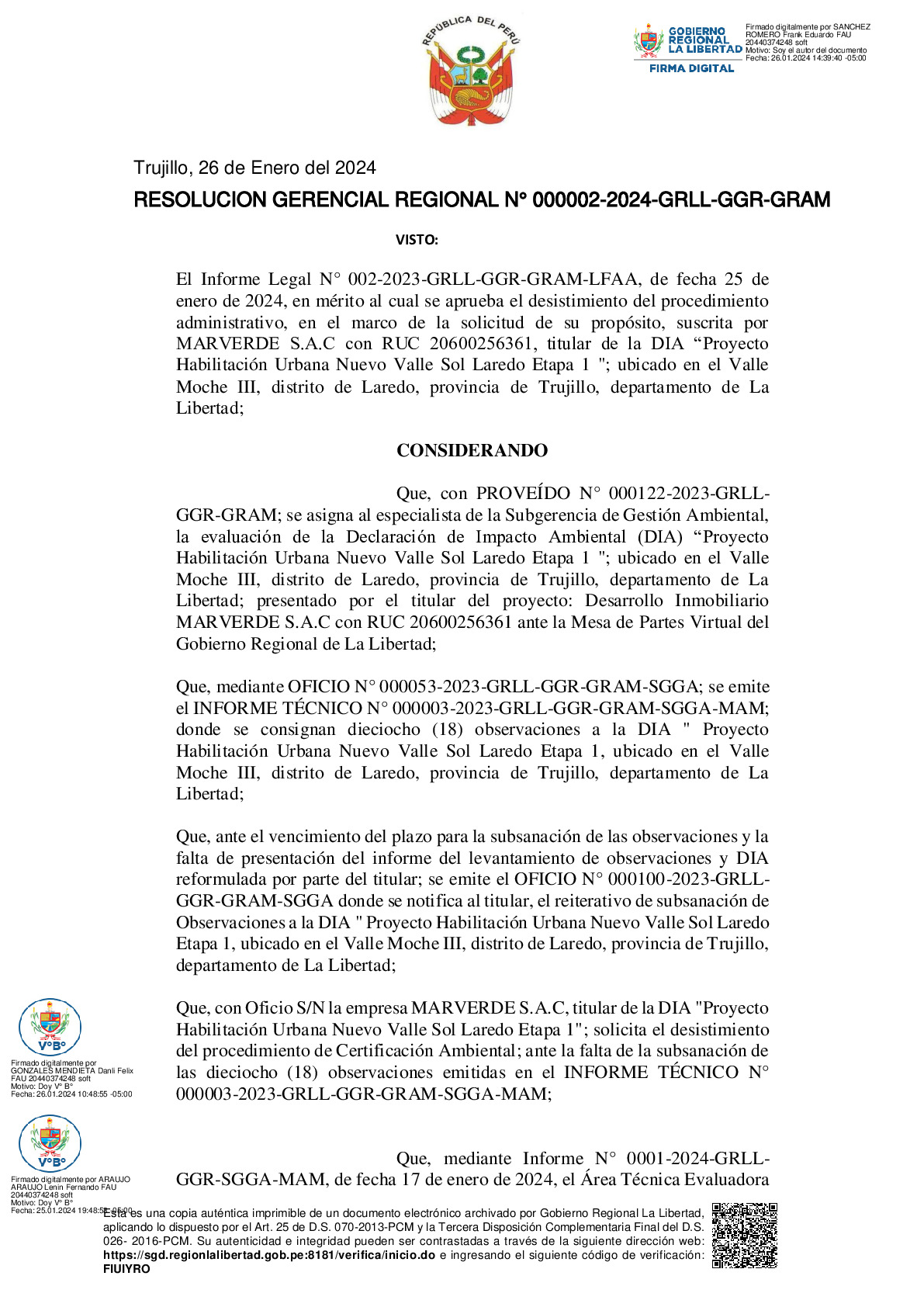 La Gerencia Regional del Ambiente, mediante RESOLUCION GERENCIAL REGIONAL N° 000002-2024-GRLL-GGR-GRAM, declara procedente el DESISTIMIENTO a la Declaración de Impacto Ambiental (DIA) del proyecto “Proyecto Habilitación Urbana Nuevo Valle Sol Laredo Etapa 1”, presentado por MARVERDE S.A.C..