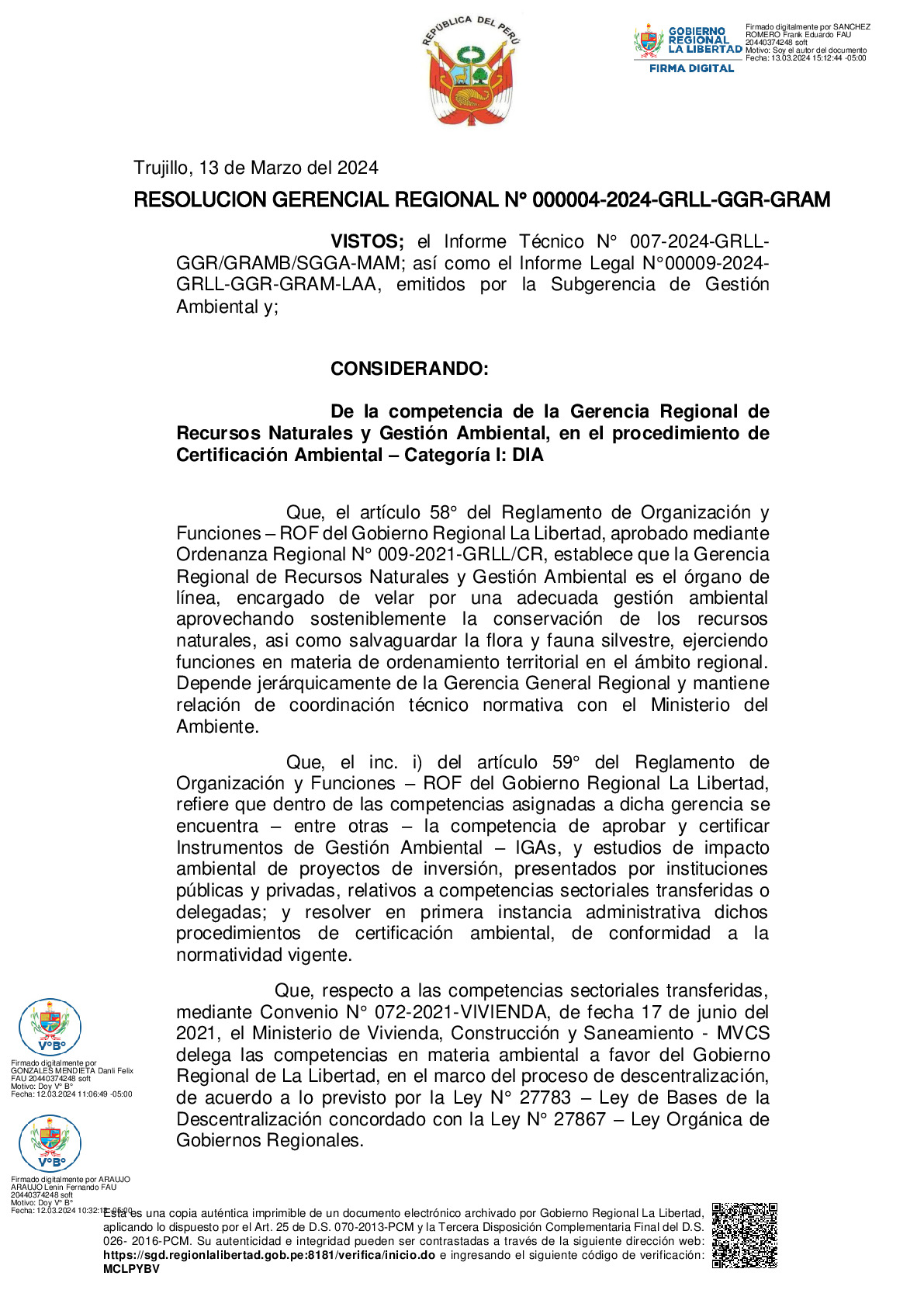 La Gerencia Regional del Ambiente, mediante RESOLUCION GERENCIAL REGIONAL N° 000004-2024-GRLL-GGR-GRAM, otorga la APROBACIÓN a la Declaración de Impacto Ambiental (DIA) del proyecto “HABILITACIÓN URBANA NUEVO VALLE SOL, DISTRITO DE LAREDO PROVINCIA DE TRUJILLO DEPARTAMENTO LA LIBERTAD”, presentado por Desarrollo Inmobiliario Marverde.