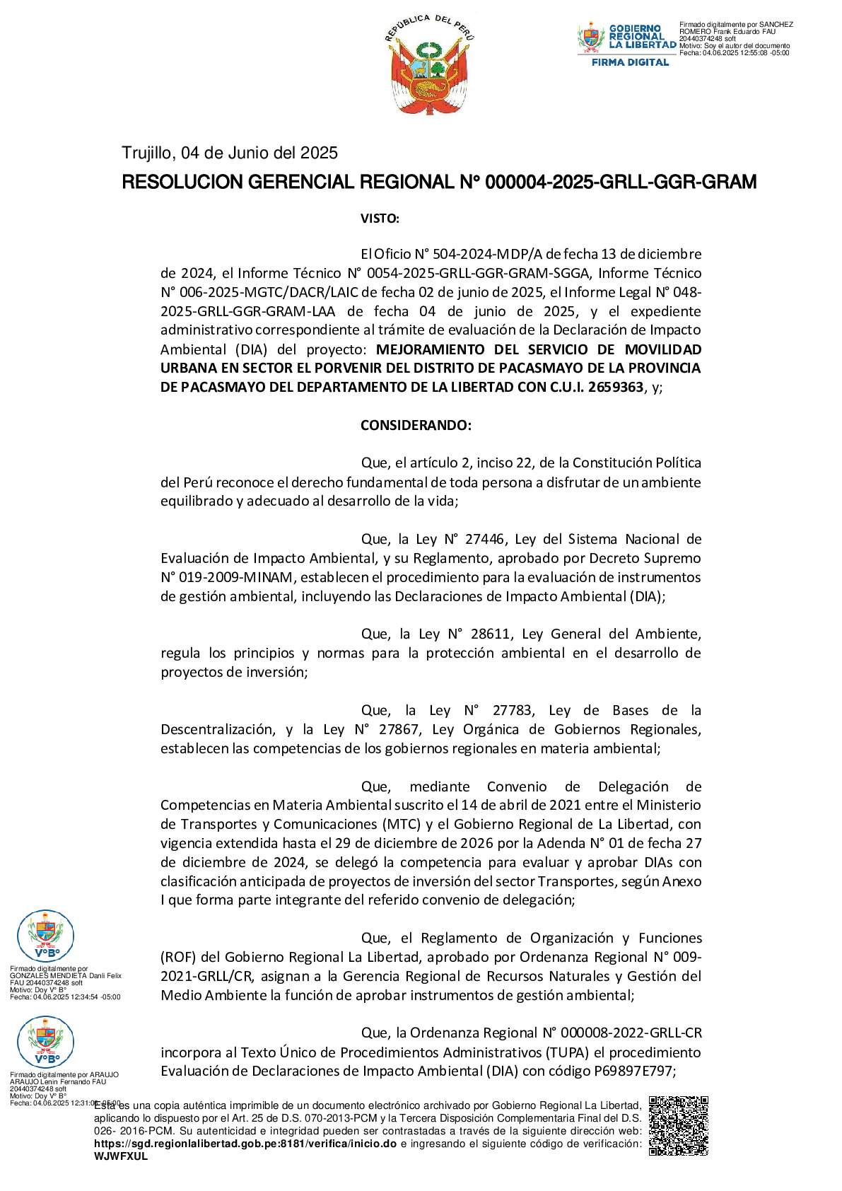 La Gerencia Regional del Ambiente, mediante RESOLUCION GERENCIAL REGIONAL N° 000004-2025-GRLL-GGR-GRAM, otorga la APROBACIÓN a la Declaración de Impacto Ambiental (DIA) del proyecto “MEJORAMIENTO DEL SERVICIO DE MOVILIDAD URBANA EN EL SECTOR EL PORVENIR DEL DISTRITO DE PACASMAYO DE LA PROVINCIA DE PACASMAYO DEL DEPARTAMENTO DE LA LIBERTAD” con CUI N° 2659363, presentado por la MUNICIPALIDAD DISTRITAL DE PACASMAYO.