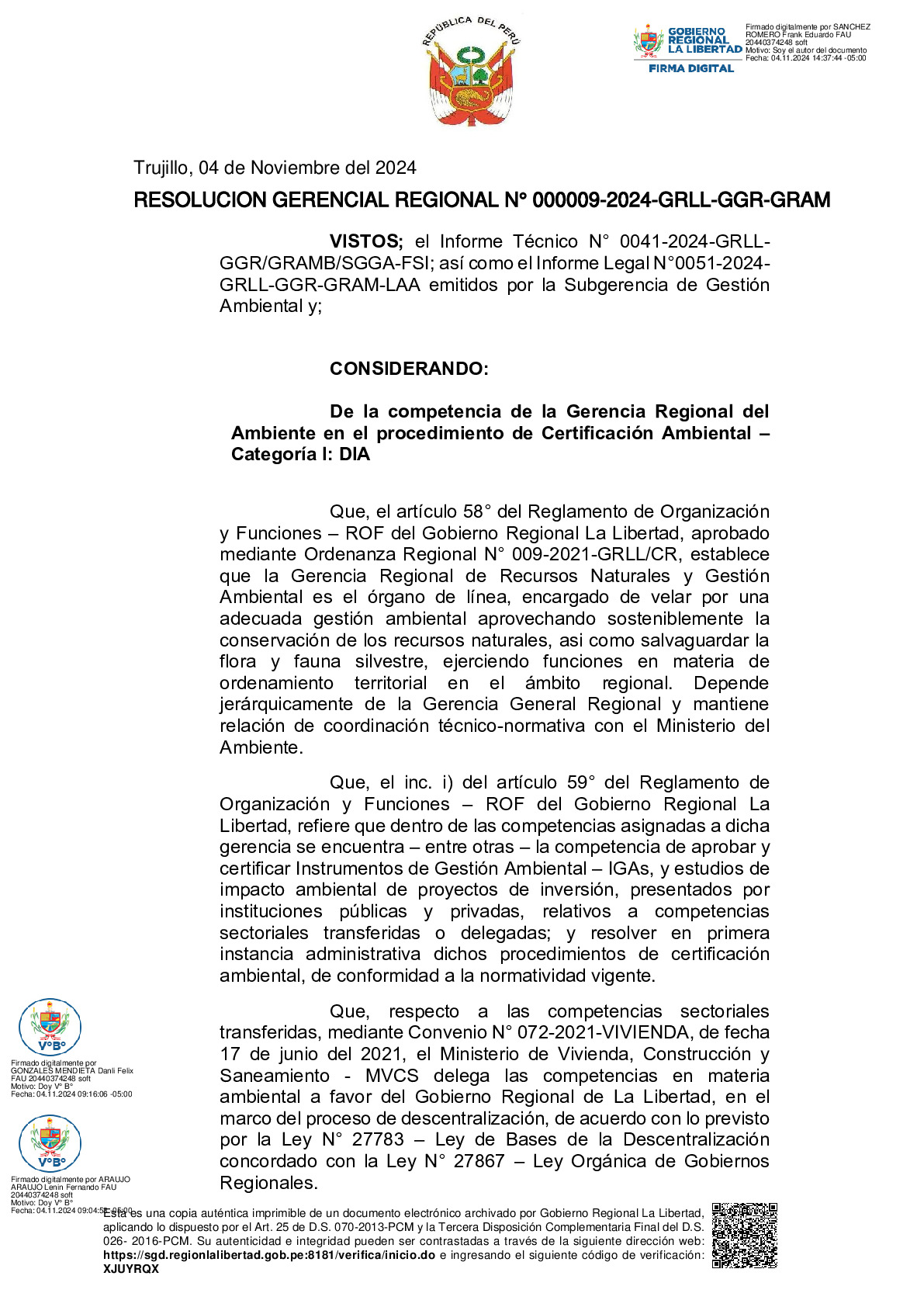La Gerencia Regional del Ambiente, mediante RESOLUCION GERENCIAL REGIONAL N° 000009-2024-GRLL-GGR-GRAM, otorga la APROBACIÓN a la Declaración de Impacto Ambiental (DIA) del proyecto “MEJORAMIENTO Y AMPLIACIÓN DEL SERVICIO DE AGUA