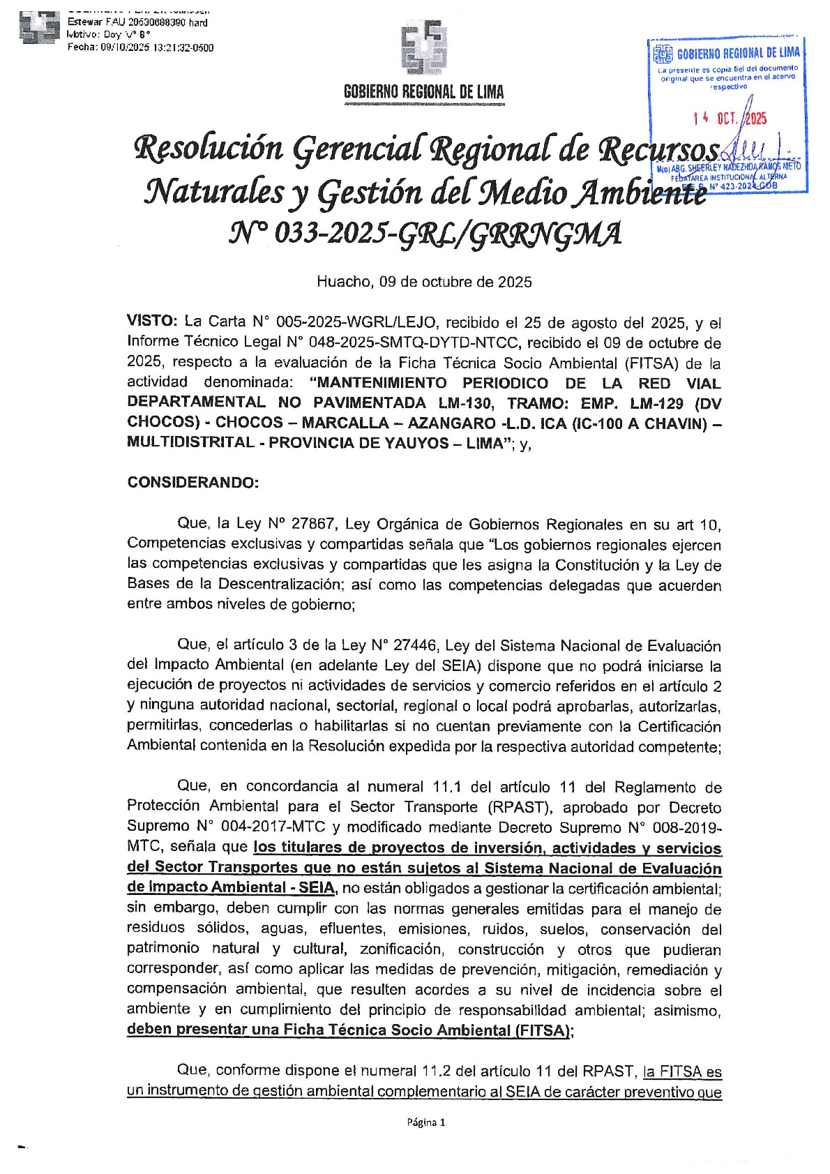 ARTÍCULO PRIMERO. – OTORGAR la CONFORMIDAD a la Ficha Técnica Socio Ambiental - FITSA de la actividad denominada: “MANTENIMIENTO PERIODICO DE LA RED VIAL DEPARTAMENTAL NO PAVIMENTADA LM-130, TRAMO: EMP. LM-129 (DV CHOCOS) - CHOCOS – MARCALLA – AZANGARO -L.D. ICA (IC-100 A CHAVIN) – MULTIDISTRITAL - PROVINCIA DE YAUYOS – LIMA”, de acuerdo al Informe Técnico Legal N° 048-2025-SMTQ-DYTD-NTCC, emitido por el Equipo Especializado de la Gerencia Regional de Recursos Naturales y Gestión del Medio Ambiente que forma parte de la presente resolución.