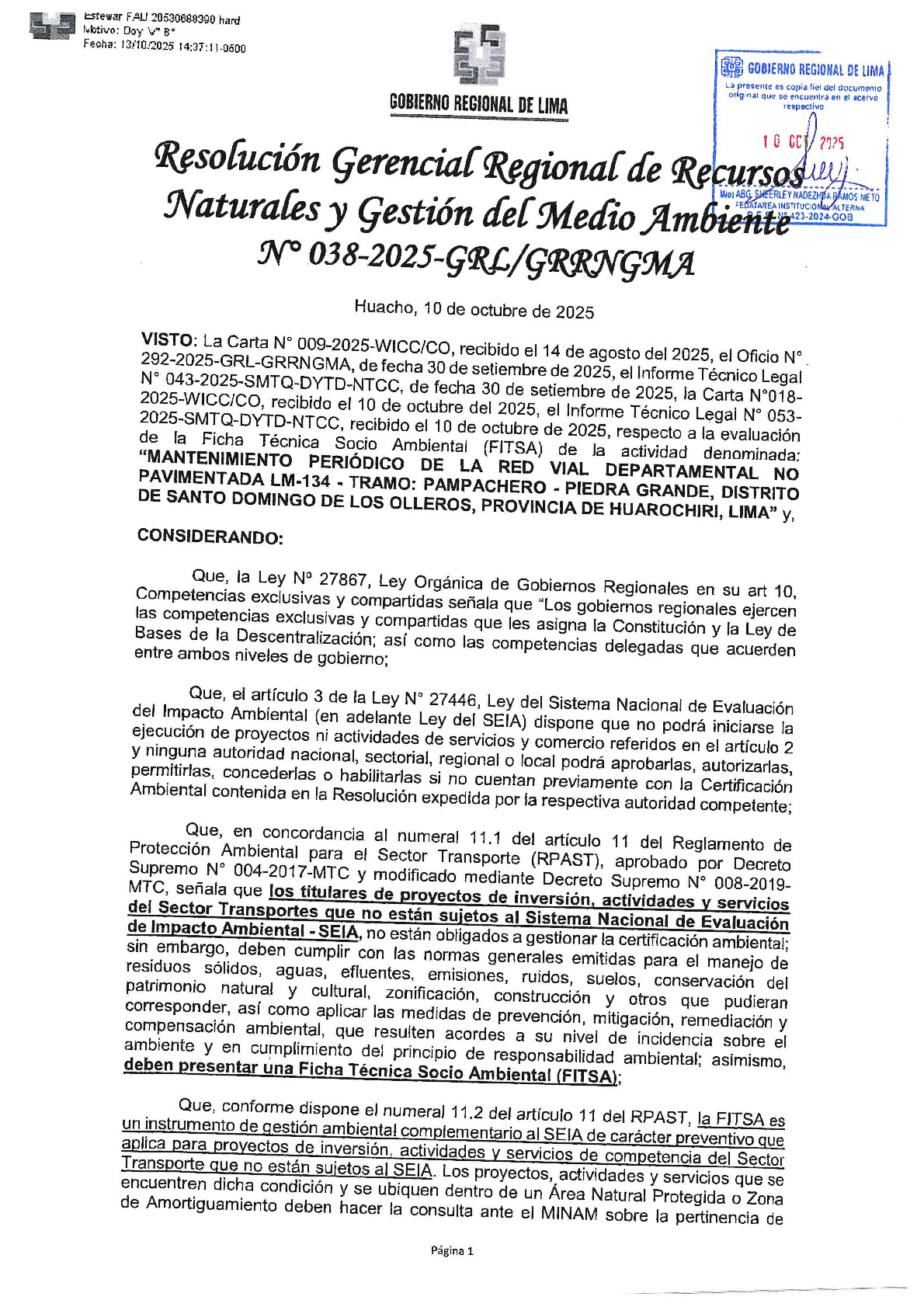 ARTÍCULO PRIMERO. – OTORGAR la CONFORMIDAD a la Ficha Técnica Socio Ambiental - FITSA de la actividad denominada: “MANTENIMIENTO PERIÓDICO DE LA RED VIAL DEPARTAMENTAL NO PAVIMENTADA LM-134 - TRAMO: PAMPACHERO - PIEDRA GRANDE, DISTRITO DE SANTO DOMINGO DE LOS OLLEROS, PROVINCIA DE HUAROCHIRI, LIMA”, de acuerdo al Informe Técnico Legal N° 053-2025-SMTQ-DYTD-NTCC, emitido por el Equipo Especializado de la Gerencia Regional de Recursos Naturales y Gestión del Medio Ambiente que forma parte de la presente resolución.