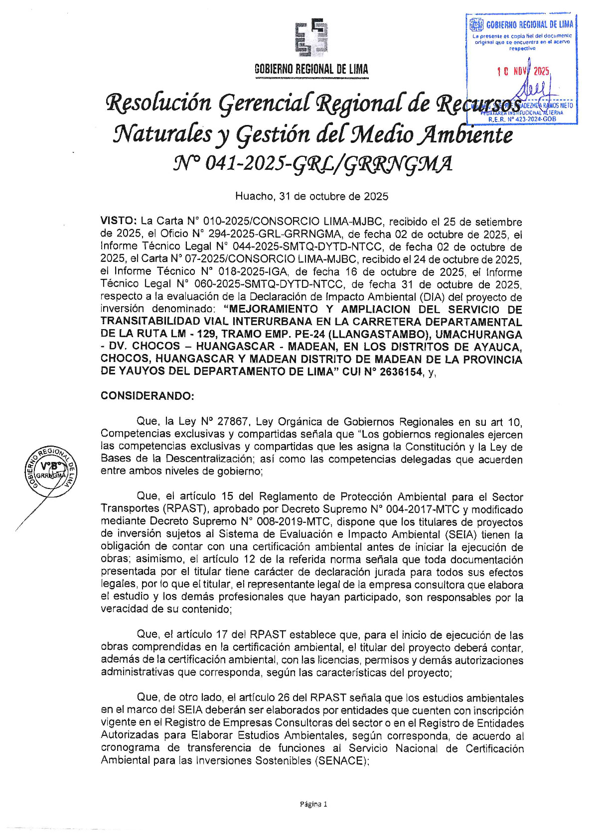 ARTÍCULO PRIMERO. – APROBAR la DECLARACIÓN DE IMPACTO AMBIENTAL (DIA) del proyecto de inversión denominado: “MEJORAMIENTO Y AMPLIACION DEL SERVICIO DE TRANSITABILIDAD VIAL INTERURBANA EN LA CARRETERA DEPARTAMENTAL DE LA RUTA LM - 129, TRAMO EMP. PE-24 (LLANGASTAMBO), UMACHURANGA - DV. CHOCOS – HUANGASCAR - MADEAN, EN LOS DISTRITOS DE AYAUCA, CHOCOS, HUANGASCAR Y MADEAN DISTRITO DE MADEAN DE LA PROVINCIA DE YAUYOS DEL DEPARTAMENTO DE LIMA” CUI N° 2636154, de conformidad los fundamentes y conclusiones del Informe Técnico Legal N° 060-2025-SMTQ-DYTD-NTCC, de fecha 31 de octubre de 2025, emitido por el Equipo Especializado de la Gerencia Regional de Recursos Naturales y Gestión del Medio Ambiente que forma parte de la presente resolución.