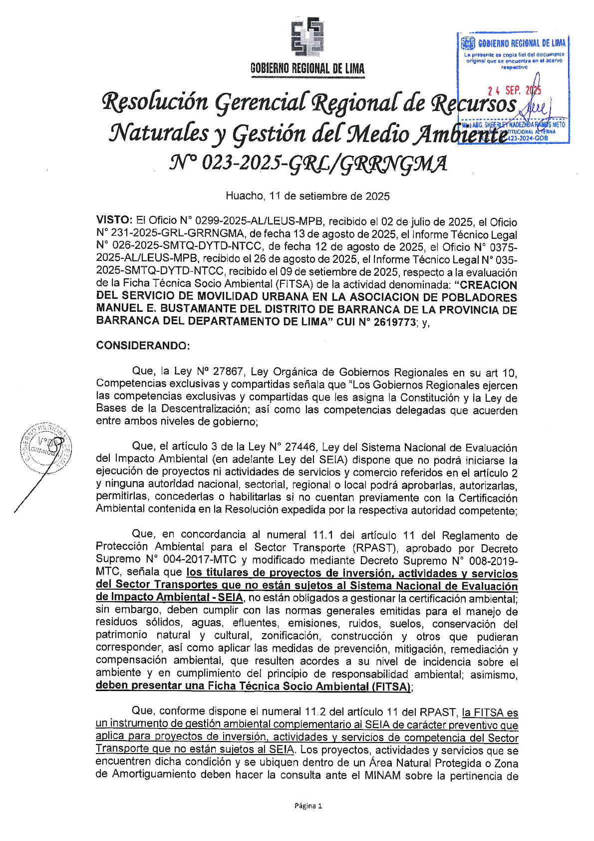 ARTÍCULO PRIMERO. – OTORGAR la CONFORMIDAD a la Ficha Técnica Socio Ambiental - FITSA del proyecto de inversión denominado: “CREACION DEL SERVICIO DE MOVILIDAD URBANA EN LA ASOCIACION DE POBLADORES MANUEL E. BUSTAMANTE DEL DISTRITO DE BARRANCA DE LA PROVINCIA DE BARRANCA DEL DEPARTAMENTO DE LIMA” CUI N° 2619773, de acuerdo al Informe Técnico Legal N° 035-2025-SMTQ-DYTD-NTCC, emitido por el Equipo Especializado de la Gerencia Regional de Recursos Naturales y Gestión del Medio Ambiente que forma parte de la presente resolución.