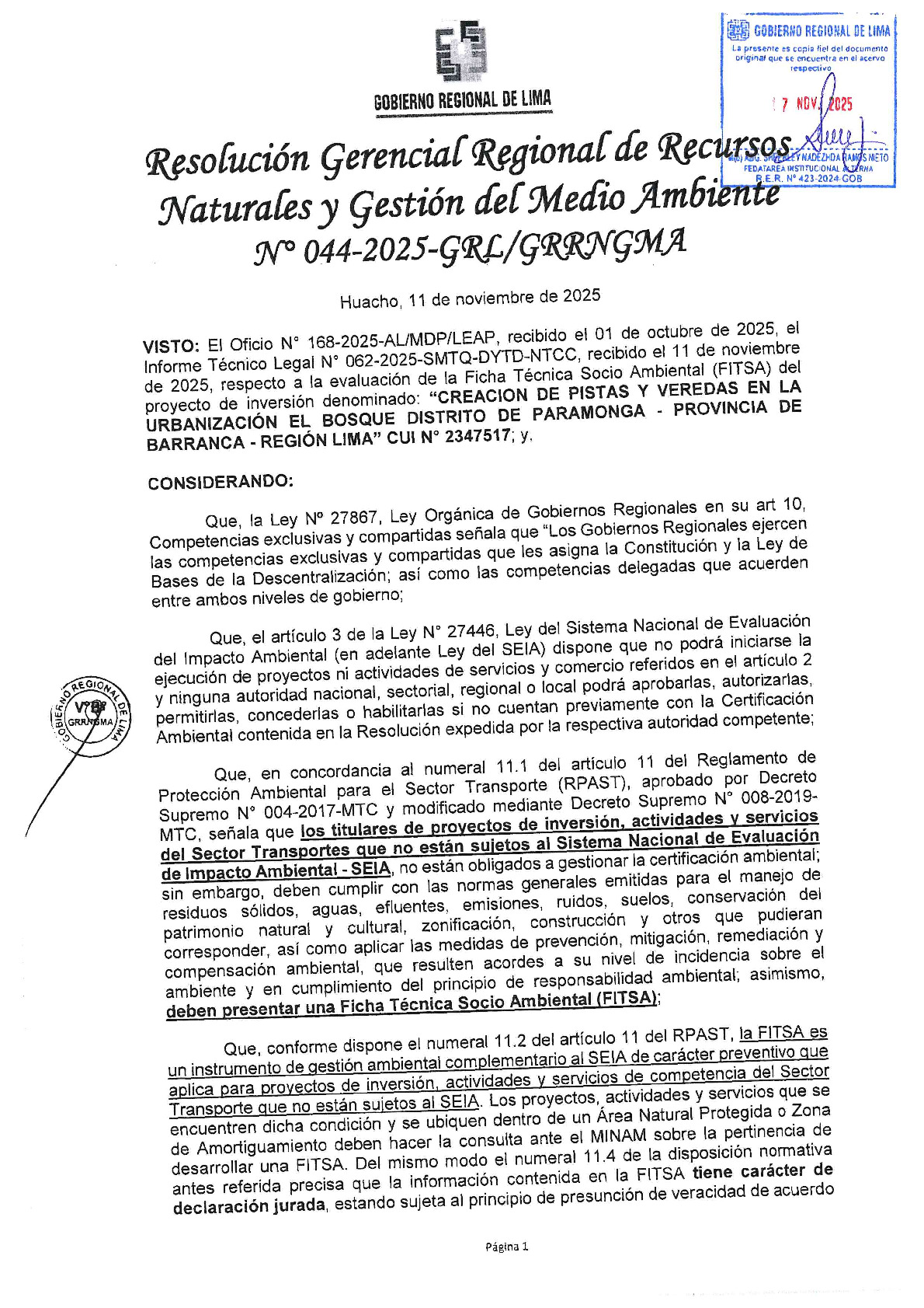 ARTÍCULO PRIMERO. – OTORGAR la CONFORMIDAD a la Ficha Técnica Socio Ambiental - FITSA del proyecto de inversión denominado: “CREACION DE PISTAS Y VEREDAS EN LA URBANIZACIÓN EL BOSQUE DISTRITO DE PARAMONGA - PROVINCIA DE BARRANCA - REGIÓN LIMA” CUI N° 2347517, de acuerdo al Informe Técnico Legal N° 062-2025-SMTQ-DYTD-NTCC, emitido por el Equipo Especializado de la Gerencia Regional de Recursos Naturales y Gestión del Medio Ambiente que forma parte de la presente resolución.