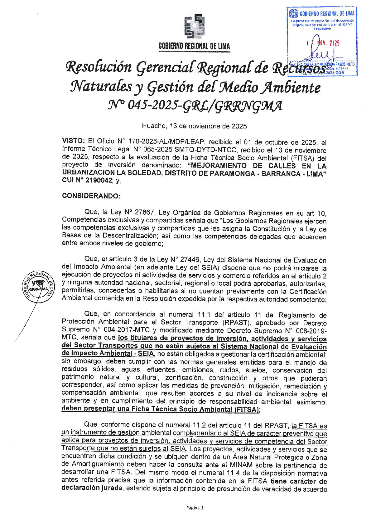 ARTÍCULO PRIMERO. – OTORGAR la CONFORMIDAD a la Ficha Técnica Socio Ambiental - FITSA del proyecto de inversión denominado: “MEJORAMIENTO DE CALLES EN LA URBANIZACION LA SOLEDAD, DISTRITO DE PARAMONGA - BARRANCA - LIMA” CUI N° 2190042, de acuerdo al Informe Técnico Legal N° 065-2025-SMTQ-DYTD-NTCC, emitido por el Equipo Especializado de la Gerencia Regional de Recursos Naturales y Gestión del Medio Ambiente que forma parte de la presente resolución.
