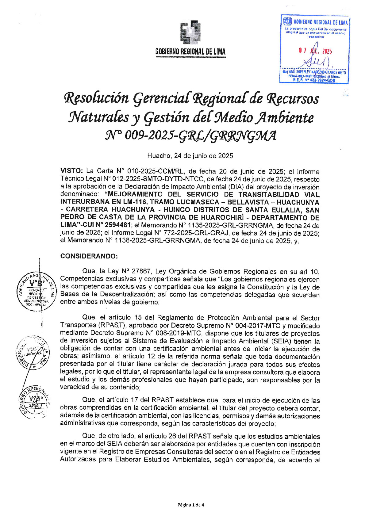 ARTÍCULO PRIMERO: APROBAR la DECLARACIÓN DE IMPACTO AMBIENTAL (DIA) del proyecto denominado “MEJORAMIENTO DEL SERVICIO DE TANSITABILIDAD VIAL INTERURBANA EN LM-116, TRAMO LUCMASECA-BELLAVISTA-HUACHUNYA-CARRETERA HUACHUNYA-CARRETERA HUACHUNYA-HUINCO DISTRITOS DE SANTA EULALIA, SAN PEDRO DE CASTA DE LA PROVINCIA DE HUAROCHIRI.DEPARTAMENTO DE LIMA”-CUI N°2594481, de acuerdo al Informe Técnico Legal N°012-2025-SMTQ-DYTD-NTCC,emitido por el Equipo Especializado de la Gerencia Regional de Recurso Naturales y gestión del Medio Ambiente que forma parte de la presente Resolución.