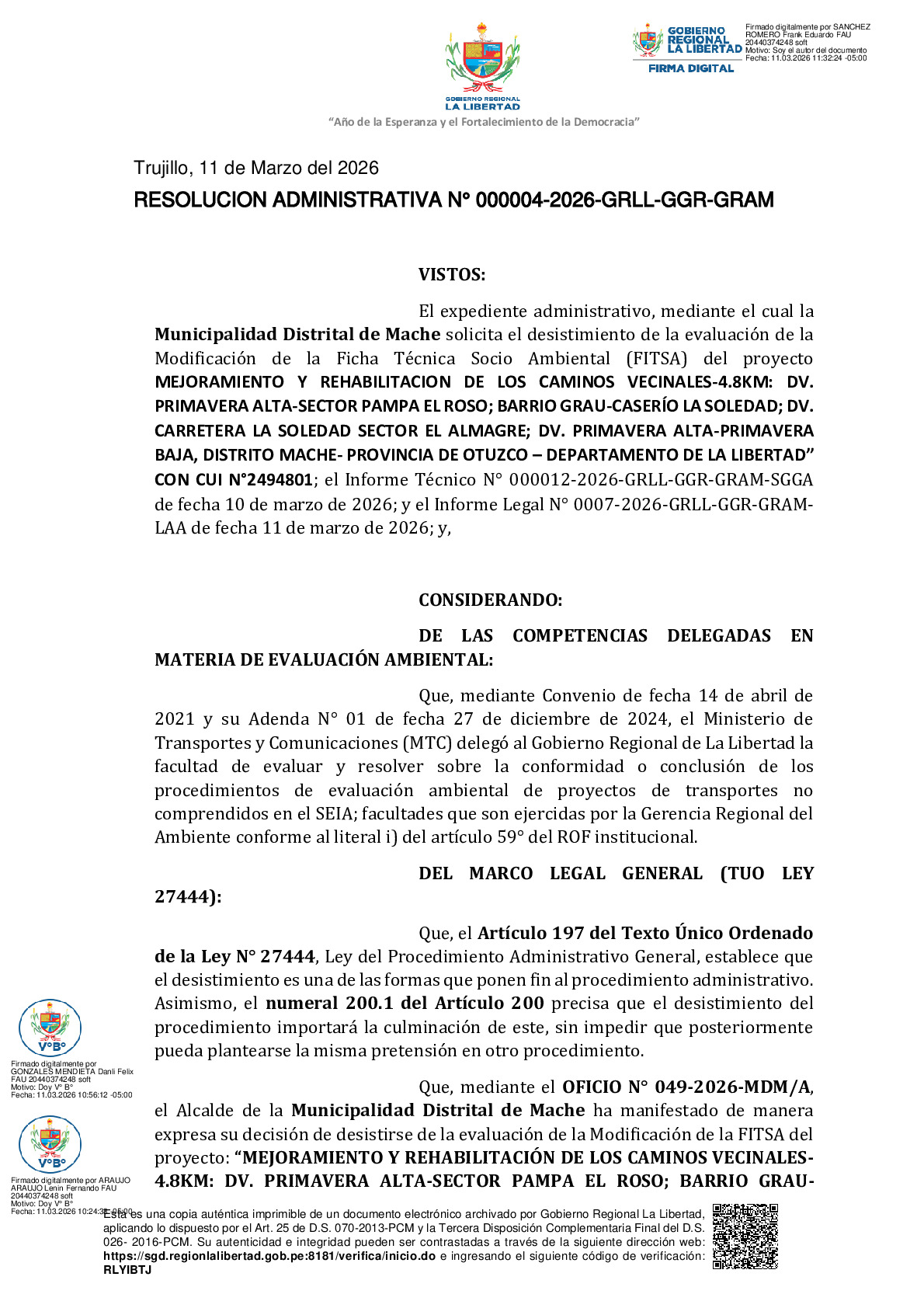La Gerencia Regional del Ambiente, mediante RESOLUCION ADMINISTRATIVA N° 000004-2026-GRLL-GGR-GRAM, declara procedente el DESISTIMIENTO solicitado por la Municipalidad Distrital de Mache a la Modificación de la Ficha Técnica Socio Ambiental (FITSA) del proyecto “MEJORAMIENTO Y REHABILITACIÓN DE LOS CAMINOS VECINALES - 4.8 KM: DV. PRIMAVERA ALTA - SECTOR PAMPA EL ROSO; BARRIO GRAU - CASERIO LA SOLEDAD; DV. CARRETERA LA SOLEDAD - SECTOR EL ALMAGRE; DV. PRIMAVERA ALTA - PRIMAVERA BAJA, DISTRITO DE MACHE - PROVINCIA DE OTUZCO - DEPARTAMENTO DE LA LIBERTAD” con CUI N° 2494801.