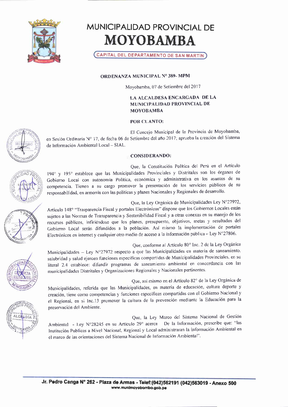 Mediante esta noram se aprueba en la provincia de Moyobamba la creacio del SIAL, esta norma fue promovida por la cam moybamba y la gerencia de recursos naturales