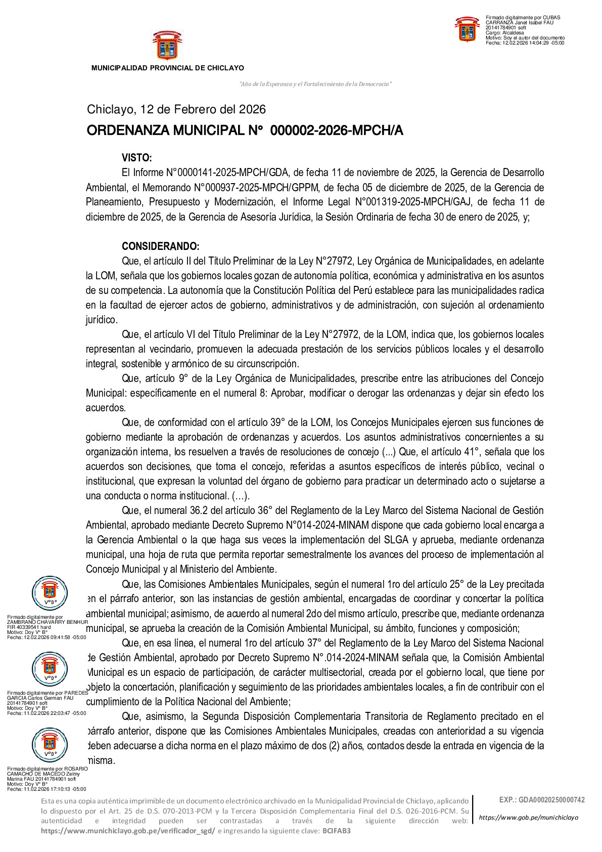 Ordenanza Municipal que aprueba la reconformación de la Comisión Ambiental de la provincia de Chiclayo, en el marco del Reglamento de la Ley Marco del Sistema Nacional de Gestión Ambiental, aprobado por Decreto Supremo N.° 014-2024-MINAM y el Reglamento Interno de la Comisión Ambiental Municipal de la provincia de Chiclayo, que consta de títulos, capítulos, artículos y disposiciones finales.